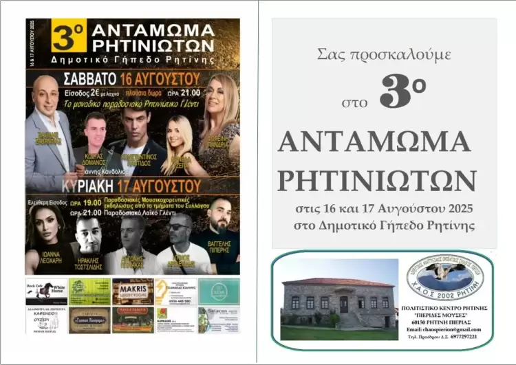 Ο Χορευτικός Αναπτυξιακός Ορειβατικός Σύλλογος (Χ.Α.Ο.Σ.) Ρητίνης απευθύνει πρόσκληση στο κοινό για το 3ο Αντάμωμα Ρητινιωτών