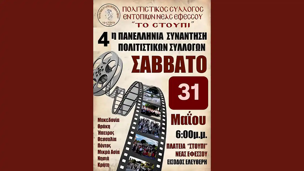 Σας προσκαλούμε στην 4η Πανελλήνια Συνάντηση Πολιτιστικών Συλλόγων που θα πραγματοποιηθεί το Σάββατο 31 Μαΐου 2025 στις 18:00 στην πλατεία “Στουπί” της Νέας Εφέσου του Δήμου Δίου-Ολύμπου.