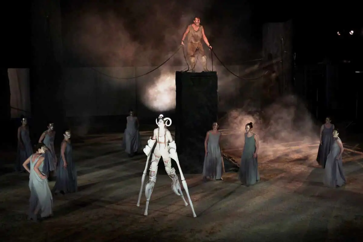 Μια συναρπαστική παράσταση σε μετάφραση Γιώργου Μπλάνα και σκηνοθεσία Άρη Μπινιάρη που αναδεικνύει μοναδικά τον τραγικό λόγο του Αισχύλου, που πραγματεύεται την αντίσταση του αλυσοδεμένου στον Καύκασο Προμηθέα, να υποκύψει στο θέλημα του «ανελέητου» Διός. Μια σπαρακτική επίκληση του πάσχοντος θεού για τον άνθρωπο, μία επίκληση ενιαία, με συνεχή κλιμάκωση από την αρχή ως το τέλος, για τον άνθρωπο. Ένας ασταμάτητος αγώνα κατά της δύναμης της εξουσίας.