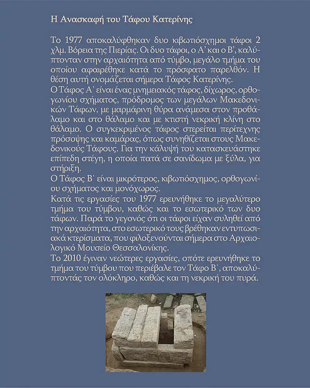 Φέτος στο πλαίσιο του 53ου Φεστιβάλ Ολύμπου, ο θεσμός των αρχαιολογικών περιπάτων μας οδηγεί σε δυο σημαντικά ταφικά μνημεία της Πιερικής πρωτεύουσας, του Τάφους Α΄ και Β΄ Κατερίνης.