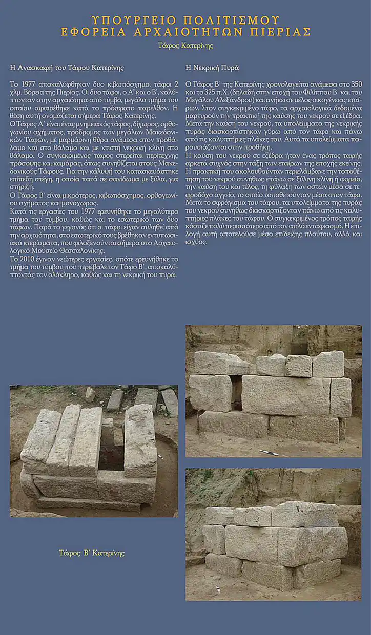 Το έργο: «Συντήρηση, Αναστήλωση, Αποκατάσταση και Ανάδειξη των Τάφων Α’ και Β’ Κατερίνης» εντάχθηκε στο Ε.Π. Κεντρικής Μακεδονίας ,ΕΣΠΑ 2021-2027 με προϋπολογισμό 665.000,00€.
