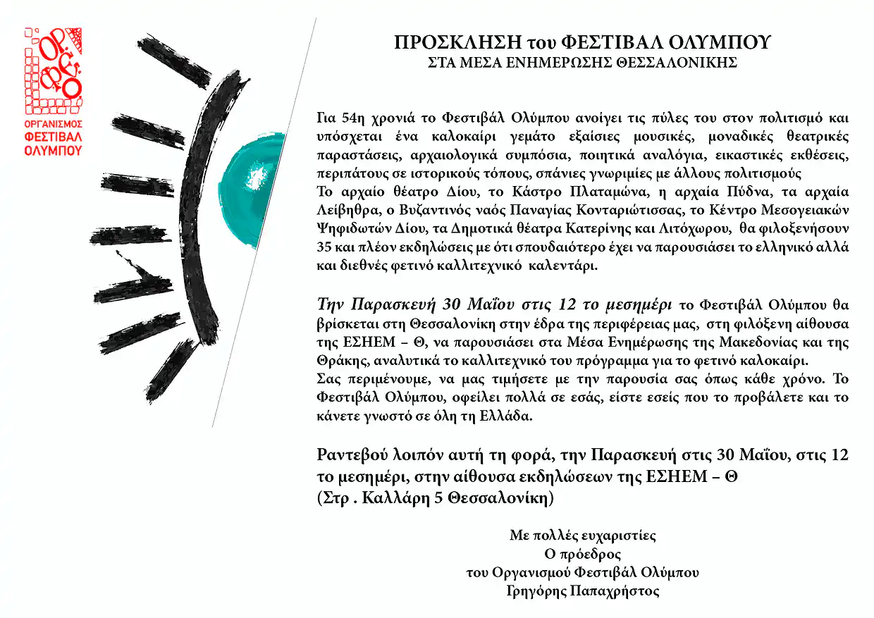 Το καλλιτεχνικό πρόγραμμα του 54ου Φεστιβάλ Ολύμπου 2025 κατά το εθιμικό, μετά την πρεμιέρα της γνωστοποίησης στο κοινό της Κατερίνης και της Πιερίας ευρύτερα, θα παρουσιαστεί από τον Οργανισμό Φεστιβάλ Ολύμπου και στη δημοσιογραφική οικογένεια αλλά και τους πολίτες της Θεσσαλονίκης και ευρύτερα της Μακεδονίας και Θράκης.