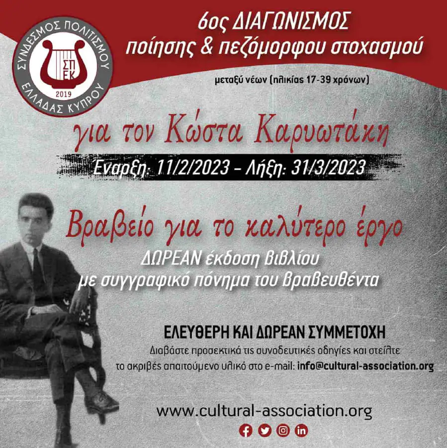 Ο Σύνδεσμος Πολιτισμού Ελλάδας Κύπρου / ΣΠΕΚ τιμώντας την Παγκόσμια Ημέρα Ελληνικής Γλώσσας 9/2/2023, προκηρύσσει 6ο Διαγωνισμό ποιήματος & πεζόμορφου ποιητικού στοχασμού μεταξύ νέων (ηλικίας 17-39 χρόνων) αφιερωμένο στον σημαντικό ποιητή του Ελληνισμού, Κώστα Καρυωτάκη. Ο 6ος Διαγωνισμός αρχίζει στις 11/2/2023 και λήγει στις 31/3/2023. Οι νέοι δεν καταβάλλουν έξοδα συμμετοχής στον Διαγωνισμό.