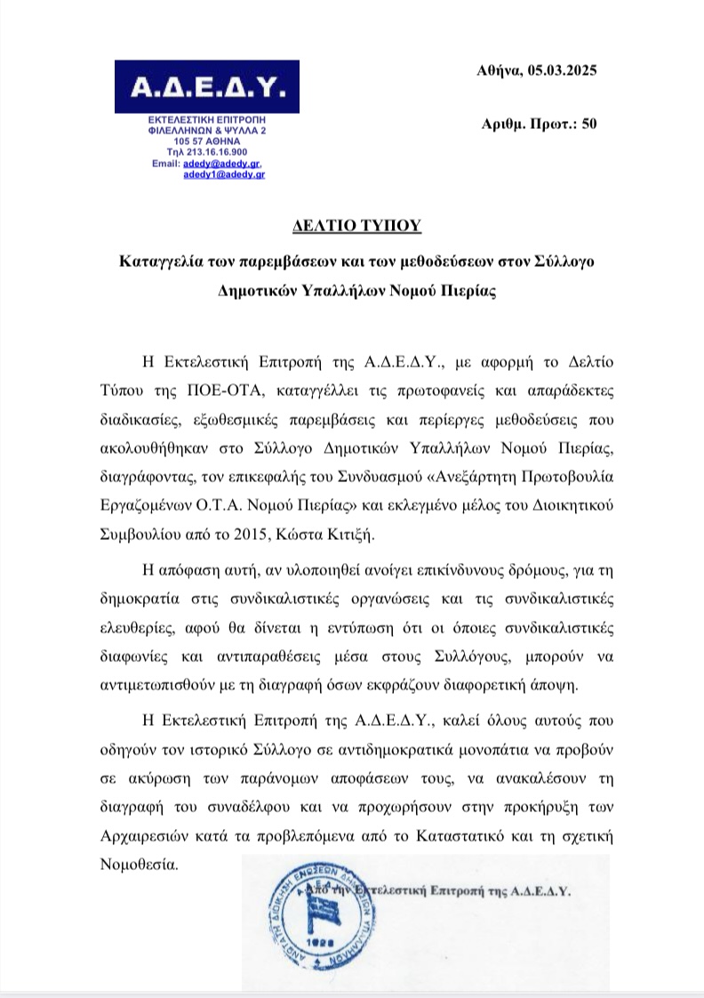 Η Εκτελεστική Επιτροπή της Α.Δ.Ε.Δ.Υ., με αφορμή το Δελτίο Τύπου της ΠΟΕ-ΟΤΑ, καταγγέλλει τις πρωτοφανείς και απαράδεκτες διαδικασίες, εξωθεσμικές παρεμβάσεις και περίεργες μεθοδεύσεις που ακολουθήθηκαν στο Σύλλογο Δημοτικών Υπαλλήλων Νομού Πιερίας, διαγράφοντας, τον επικεφαλής του Συνδυασμού «Ανεξάρτητη Πρωτοβουλία Εργαζομένων Ο.Τ.Α. Νομού Πιερίας» και εκλεγμένο μέλος του Διοικητικού Συμβουλίου από το 2015, Κώστα Κιτιξή.