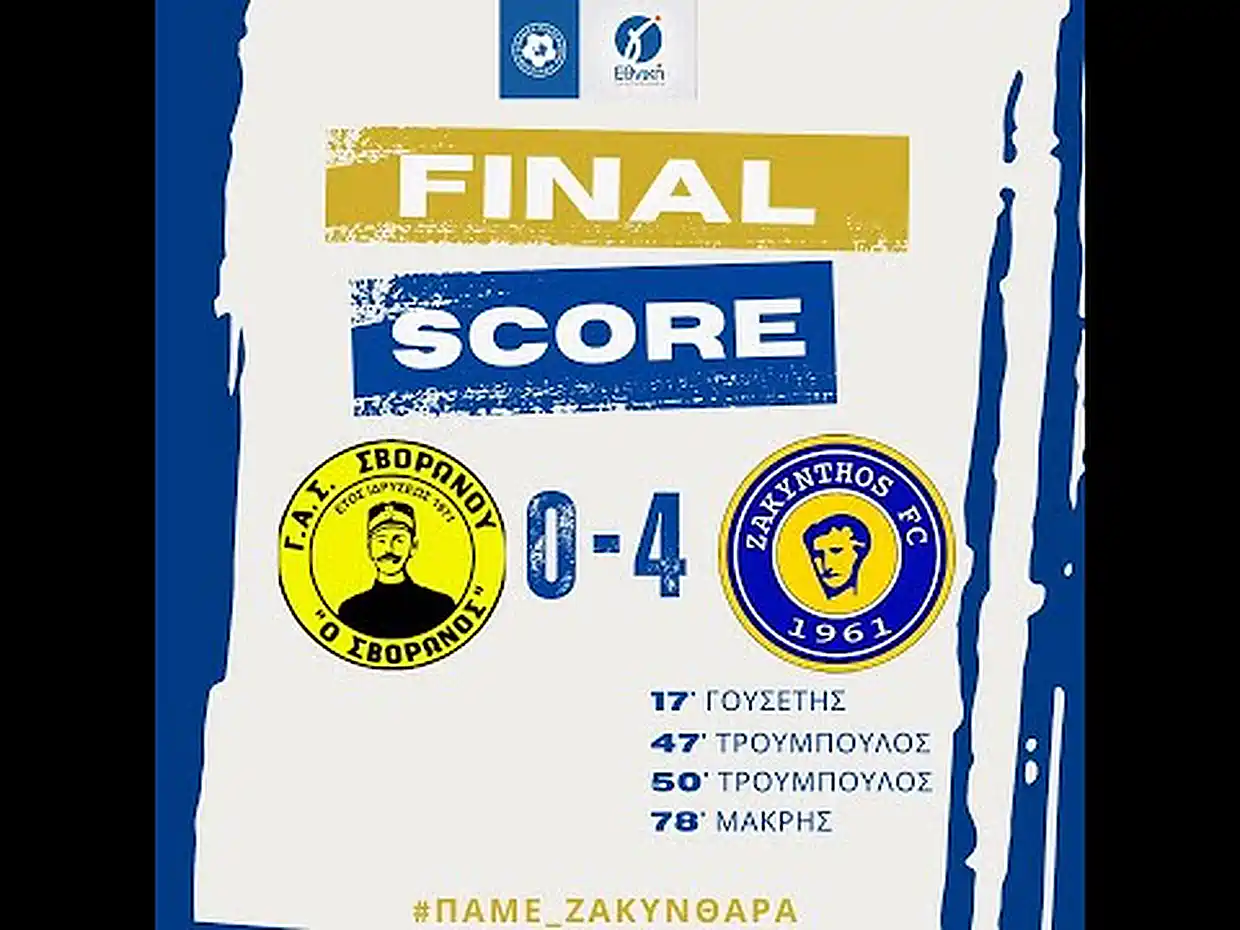 Τα γκολ για τη Ζάκυνθο πέτυχαν ο Γουσέτης στο 18′ με δυνατό σουτ, ο Τρούμπουλος στο 47′ και στο 49′ με ισάριθμες κεφαλιές και ο Μακρής στο 77′ με κεφαλιά.