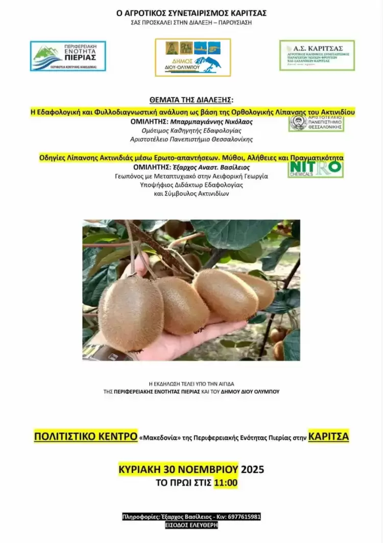 Ομιλητής: Βασίλειος Αναστ. Έξαρχος, γεωπόνος με μεταπτυχιακό στην αειφορική γεωργία, υποψήφιος Διδάκτωρ Εδαφολογίας και σύμβουλος ακτινιδίων