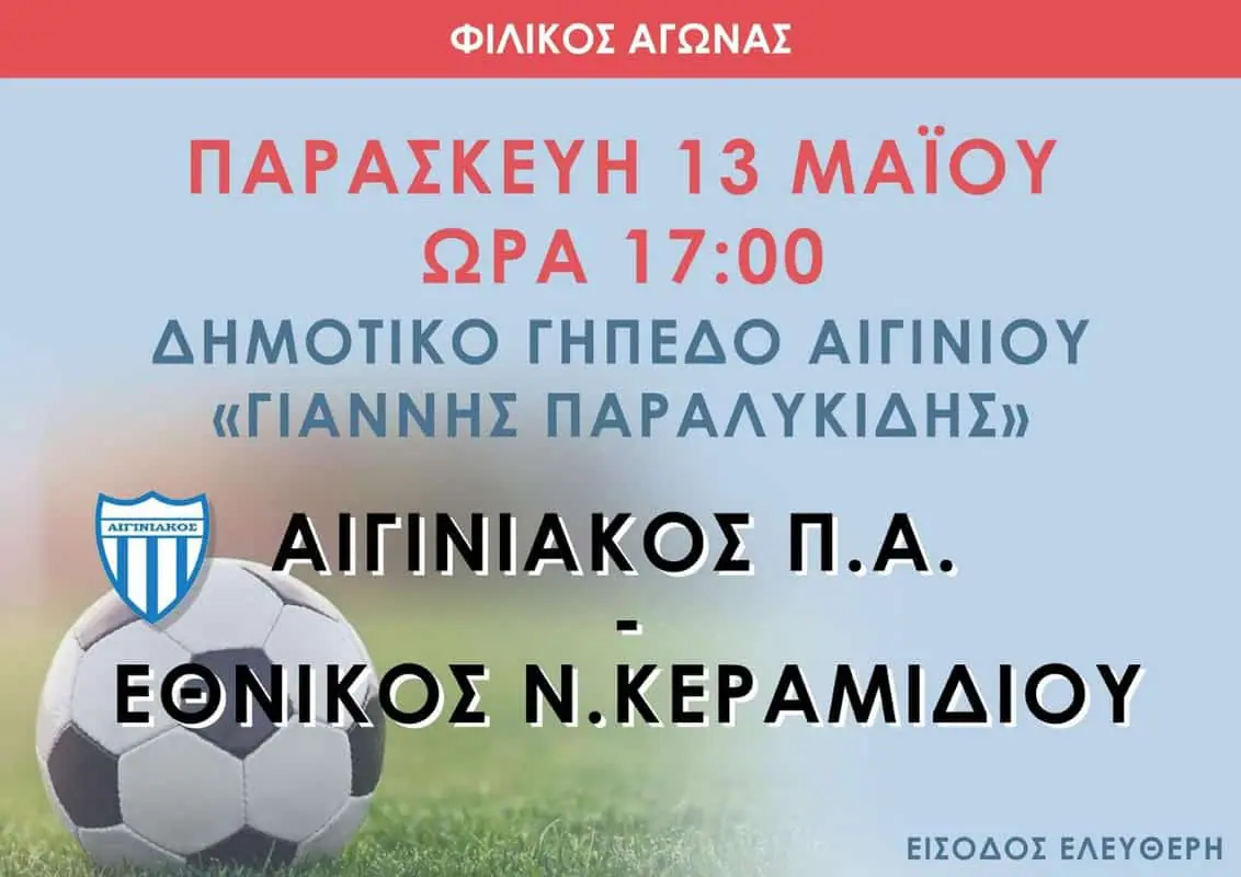 Α): Ενδιαφέρον φιλικό αγώνα με τον Εθνικό Νέου Κεραμιδίου στο Δημοτικό γήπεδο Αιγινίου “Γιάννης Παραλυκίδης” στις 5:00 μ.μ.