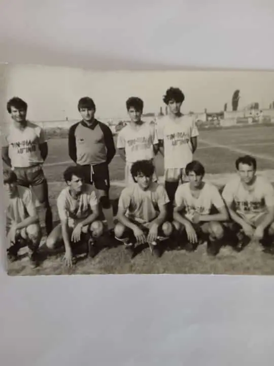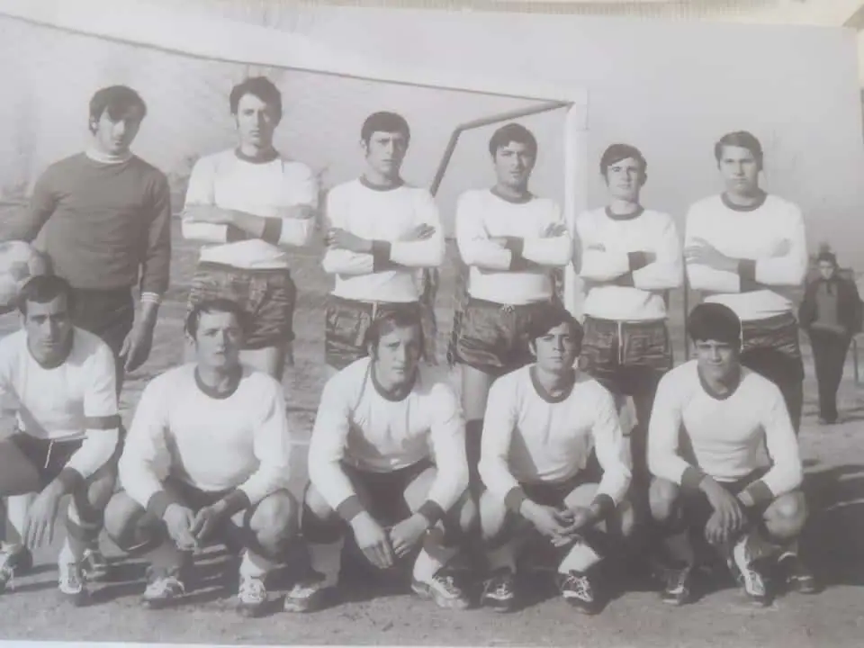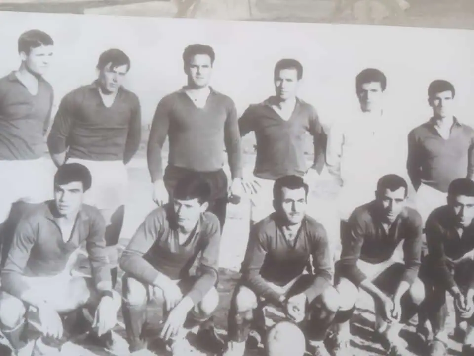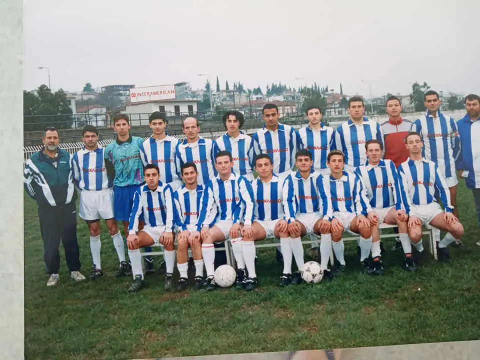1): Ο Βασίλης Κωνσταντινίδης με τη φανέλα του Εθνικού Αιγινίου καθήμενος τρίτος από αριστερά.