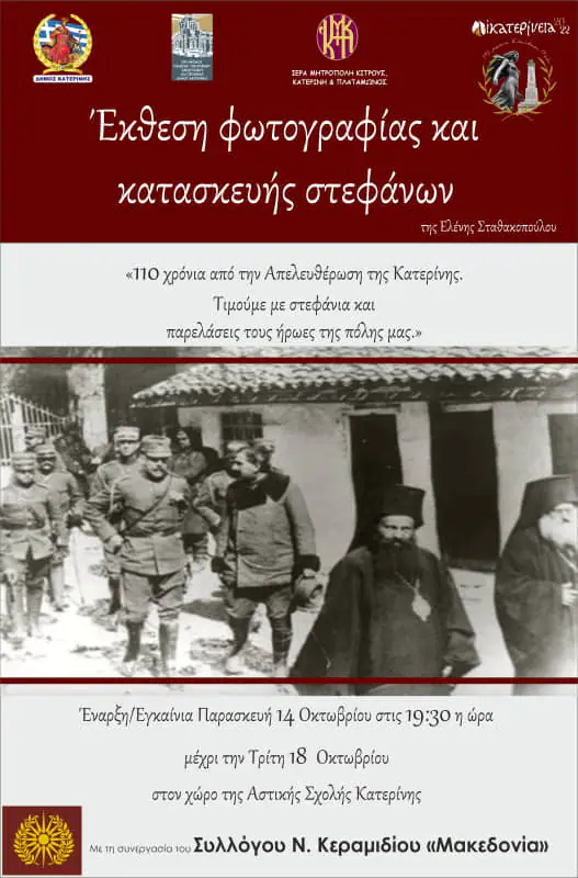 Στην Κατερίνη, που γιορτάζει τα 110 χρόνια (1912 – 1922) από την απελευθέρωσή της από τον Οθωμανικό ζυγό, τιμώντας κάθε χρόνο με παρελάσεις, κατάθεση στεφάνων και άλλες εκδηλώσεις τους πεσόντες, επικεντρώνεται η έκθεση της Ελένης Σταθακοπούλου, Αρχιτέκτονος Μηχανικού – Εκπαιδευτικού.