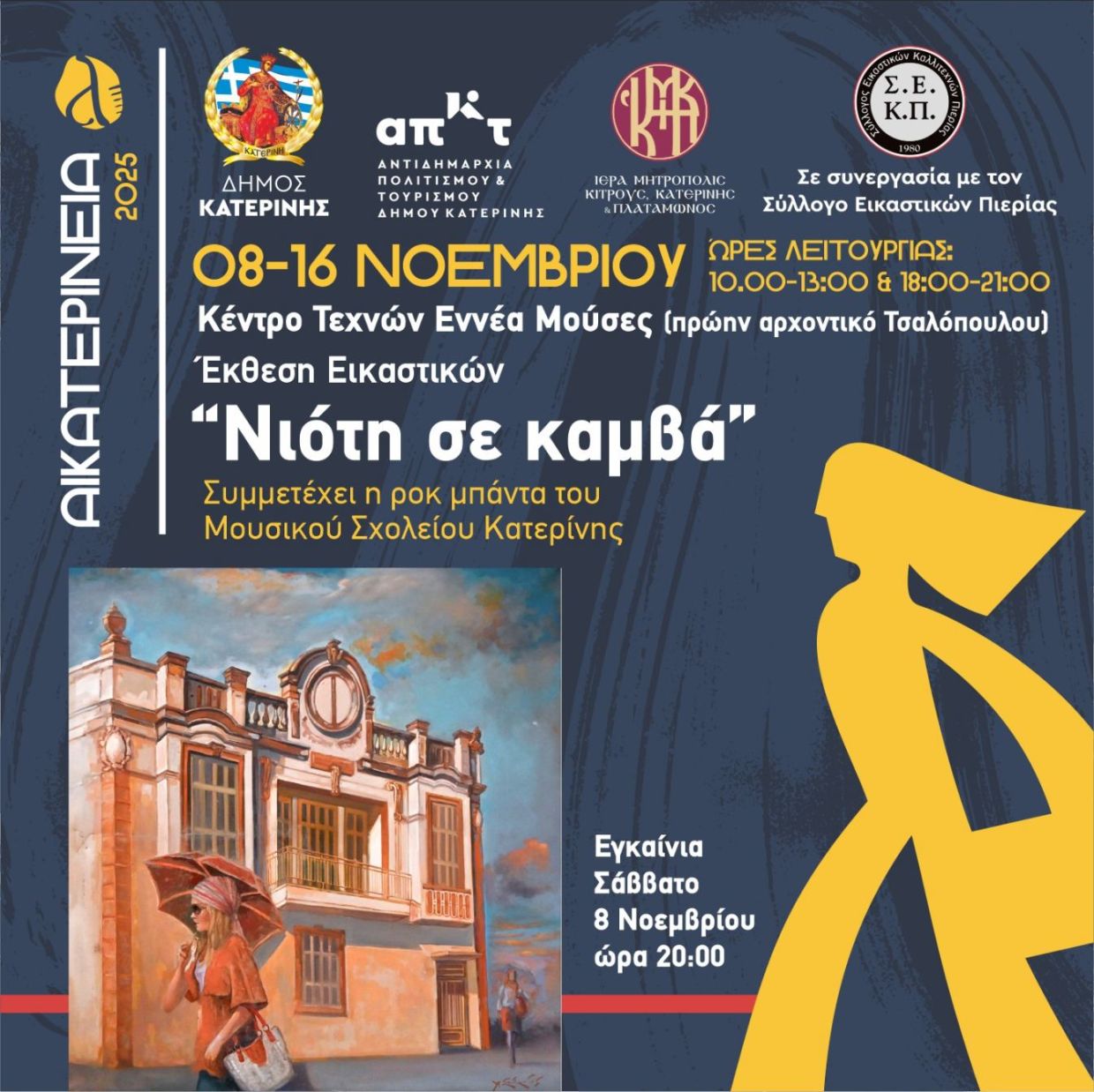Η έκθεση, που θα διαρκέσει από τις 8 έως τις 16 Νοεμβρίου, φιλοξενεί έργα ζωγραφικής, γλυπτικής και φωτογραφίας από εικαστικούς του νομού Πιερίας. Παράλληλα, θα παρουσιαστούν και έργα από τη συλλογή του Δήμου Κατερίνης, αναδεικνύοντας τη συνέχεια και τη ζωντάνια της τοπικής καλλιτεχνικής κοινότητας.