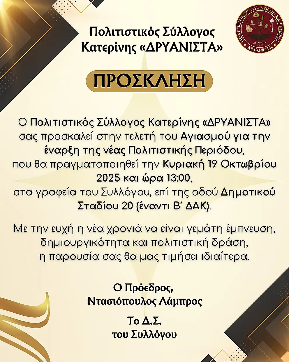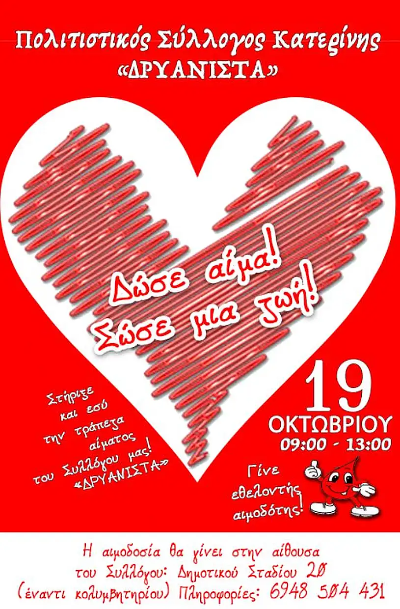 Ολύμπιο Βήμα » Επικαιρότητα » Δελτία Τύπου » Αιμοδοσία & Αγιασμός στον Πολιτιστικό Σύλλογο Κατερίνης «Δρυάνιστα», την Κυριακή 19 Οκτωβρίου