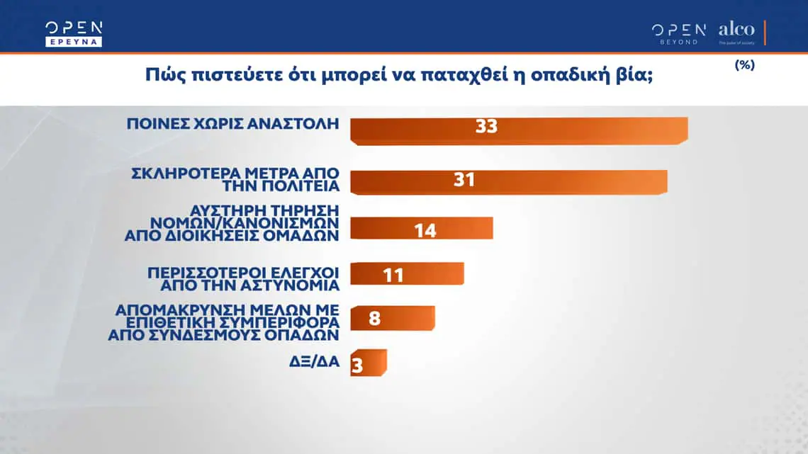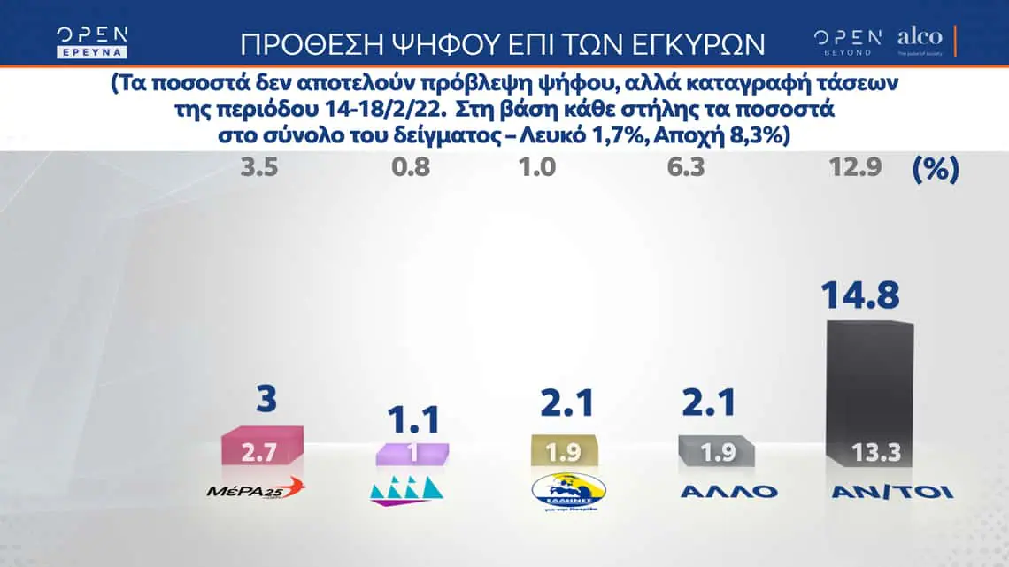 Η μεγάλη δημοσκόπηση του κεντρικού δελτίου Ειδήσεων του OPEN, που διαμορφώθηκε και από ερωτήματα πολιτών, πραγματοποιήθηκε από τις 14 έως τις 18 Φεβρουαρίου 2022 από την Alco και μεταδόθηκε τη Δευτέρα 21 Φεβρουαρίου.