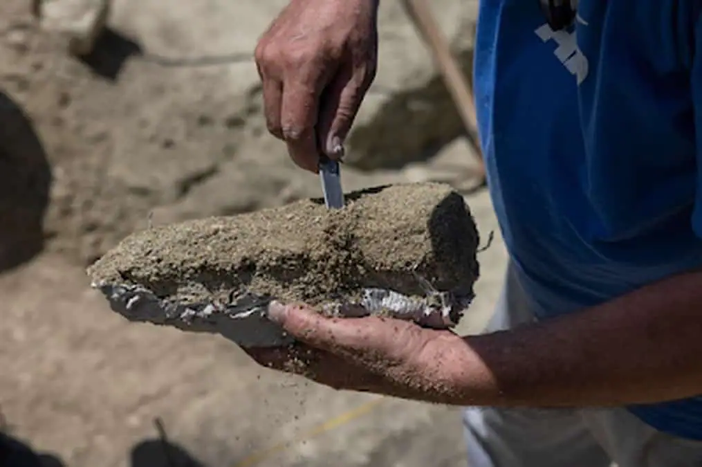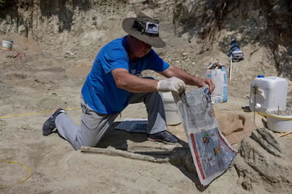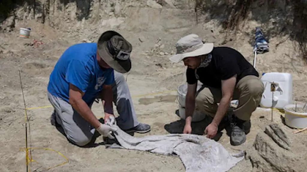 Μπορεί το ίδιο βράδυ στην πλατεία της Νεοκαισάρειας να ετοιμάζεται εκδήλωση με ομιλία της κυρίας Tσουκαλά και του Διδάκτορα Παλαιοντολογίας, Γιώργου Κονιδάρη, που είναι μαζί της, όμως προέχει η ανασκαφή. Ο σπηλαιολόγος–ερευνητής Βασίλης Μακρίδης είναι δίπλα στην Ευαγγελία Τσουκαλά πολλά χρόνια. Αναλαμβάνει εκείνος να δημιουργήσει την υποδομή για να «σηκωθούν» τα ευρήματα, προκειμένου να μην υποστούν αλλοιώσεις. Η τέχνη, μοναδική. Δημιουργεί καλούπι από γύψο. Τυλίγει το απολίθωμα με βρεγμένες εφημερίδες, βάζει ένα κομμάτι λινάτσα σε έναν κουβά από γύψο και μετά τυλίγει το εύρημα με τη λινάτσα. Πάνω της «αλείφει» και άλλον γύψο, δημιουργώντας το καλούπι πάνω στο εύρημα. Με αριστοτεχνικές κινήσεις, μαζί με τους φοιτητές λίγο αργότερα θα το αφαιρέσει από τον χώρο για να μεταφερθεί με ασφάλεια. Να καθαριστεί και να μελετηθεί. «Ένα συμπαγές απολίθωμα, όπως ένα τμήμα του αστραγάλου βγαίνει αμέσως. Αυτό θέλει προσοχή», μας ενημερώνει μία μεταπτυχιακή φοιτήτρια.