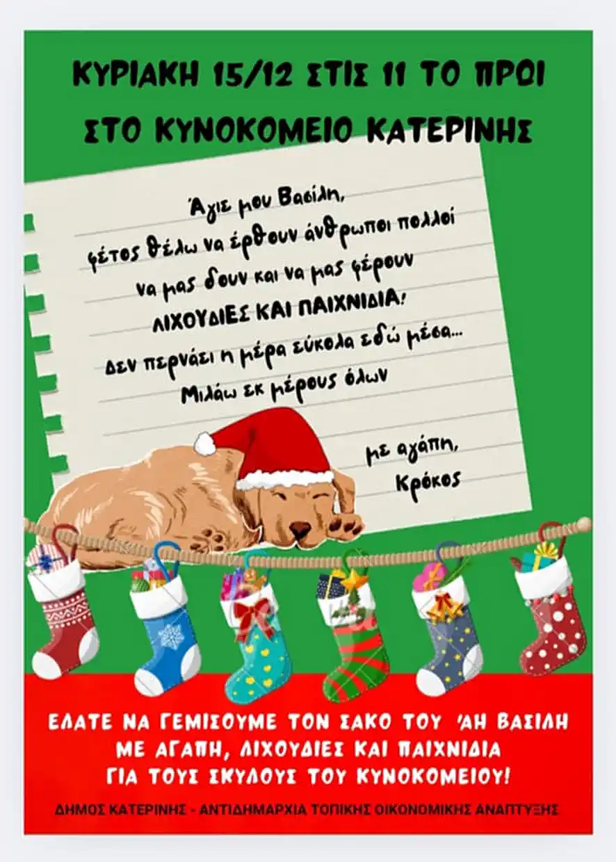 Η προγραμματισμένη για αύριο Κυριακή, Γιορτή στο Κυνοκομείο Κατερίνης αναβάλλεται λόγω καιρικών συνθηκών και θα πραγματοποιηθεί την Κυριακή 15 Δεκεμβρίου.