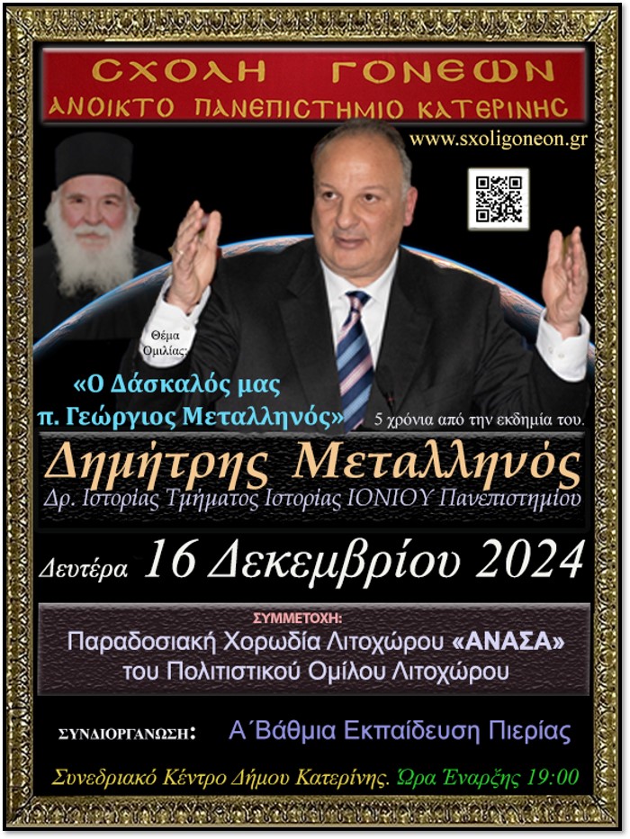 Ανοικτό Πανεπιστήμιο Κατερίνης: Αφιέρωμα στον μακαριστό π. Γεώργιο Μεταλληνό την Δευτέρα 16 12 2024