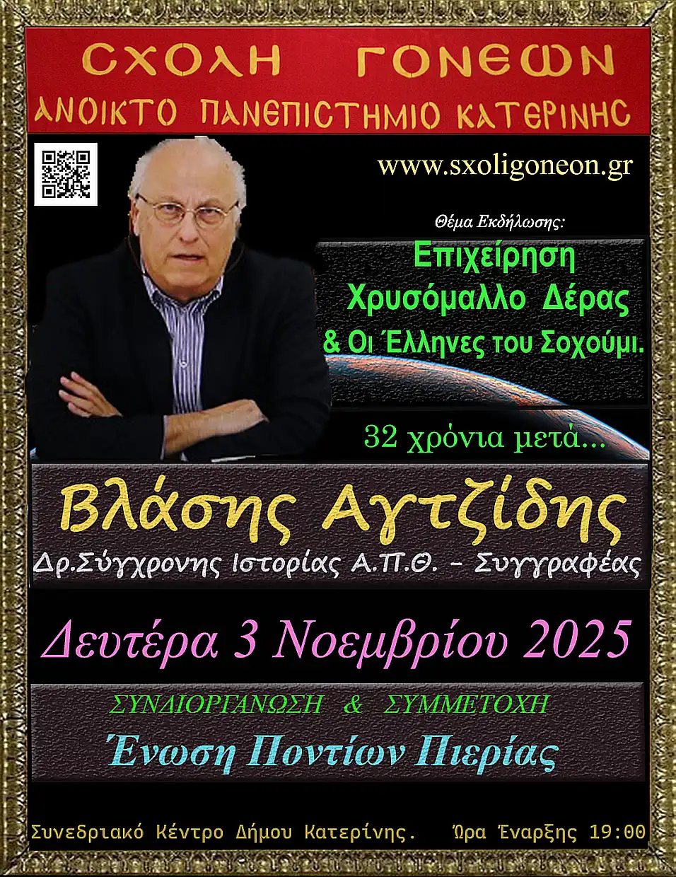 32 χρόνια μετά, ο Δρ. Σύγχρονης Ιστορίας Α.Π.Θ. και συγγραφέας Βλάσης Αγτζίδης θα «ζωντανέψει» στους φίλους της Σχολής Γονέων – Ανοικτό Πανεπιστήμιο Κατερίνης την επιχείρηση Χρυσόμαλλο Δέρας που οργανώθηκε τον Αύγουστο του 1993 από την Ελλάδα. Η Εκδήλωση γίνεται σε Συνδιοργάνωση με την Ένωση Ποντίων Πιερίας όπου μέλη του Θεατρικού τμήματος του Συλλόγου θα απαγγείλουν σχετικά αποσπάσματα στο Συνεδριακό κέντρο Κατερίνης (ΕΚΑΒΗ) στις 19:00 και όπως πάντα η είσοδος είναι Ελεύθερη.