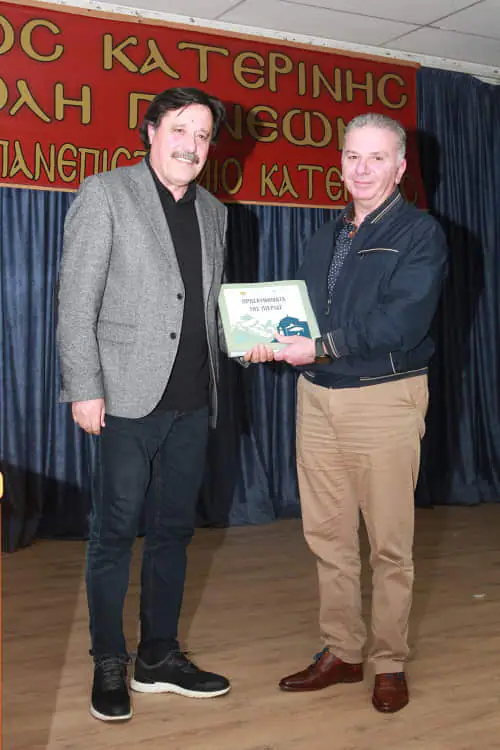 Η αντιπεριφερειάρχης Πιερίας κ. Σοφία Μαυρίδου προσέφερε στον κ. Καλεντερίδη το λεύκωμα «ΟΛΥΜΠΟΣ», ο πρόεδρος της Ένωσης Ποντίων Πιερίας κ. Κωνσταντίνος Παπουτσίδης προσέφερε το λεύκωμα «Προσκυνήματα της Πιερίας», ο π. Χρήστος Αποστολός προσέφερε το επετειακό λεύκωμα της Σχολής Γονέων για τα τριάντα της χρόνια και τέλος ο πρόεδρος της Σχολής Γονέων κ. Κωνσταντίνος Κορομπίλης την αναμνηστική πλακέτα της εκδήλωσης στον κ. Σάββα Καλεντερίδη.