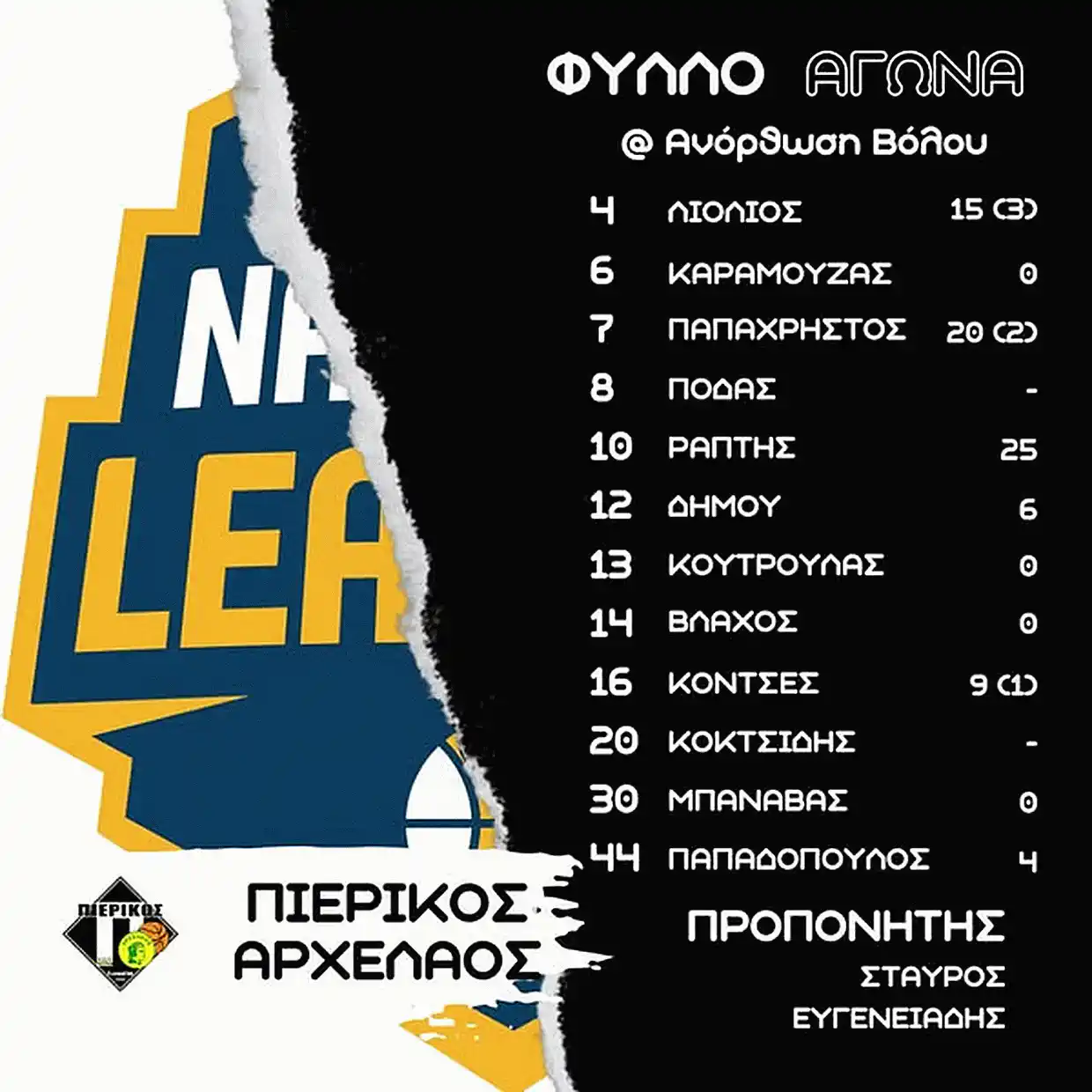 H ομάδα της Κατερίνης προσπάθησε για το αποτέλεσμα μέχρι το τέλος πλην όμως δεν τα κατάφερε με τους γηπεδούχους να μπαίνουν μπροστά με 30 βαθμούς έναντι 29 βαθμών του Πιερικού Αρχέλαου που ακολουθεί κατα πόδας.