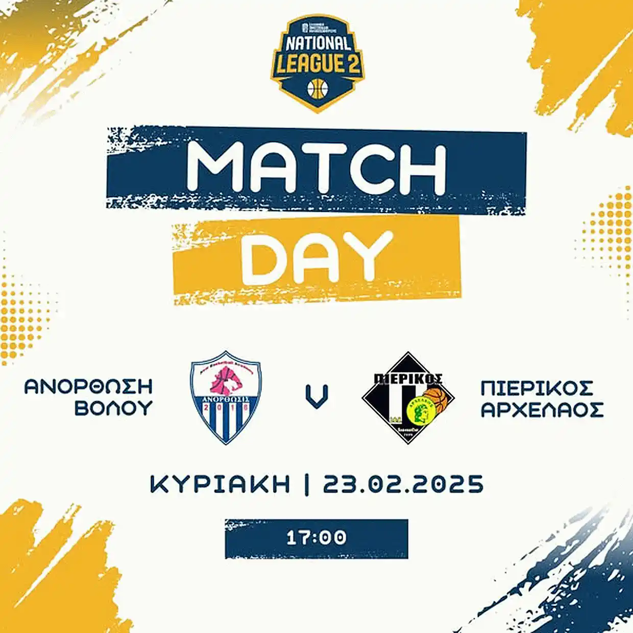 Την Ανόρθωση Βόλου (8-8) αντιμετωπίζει ο Πιερικός Αρχέλαος (12-4) την Κυριακή 23 Φεβρουαρίου στις 17:00, στο Κλειστό Γυμναστήριο του Εθνικού Αθλητικού Κέντρου Βόλου, στο πλαίσιο της 19ης αγωνιστικής του 4ου ομίλου της National League 2.