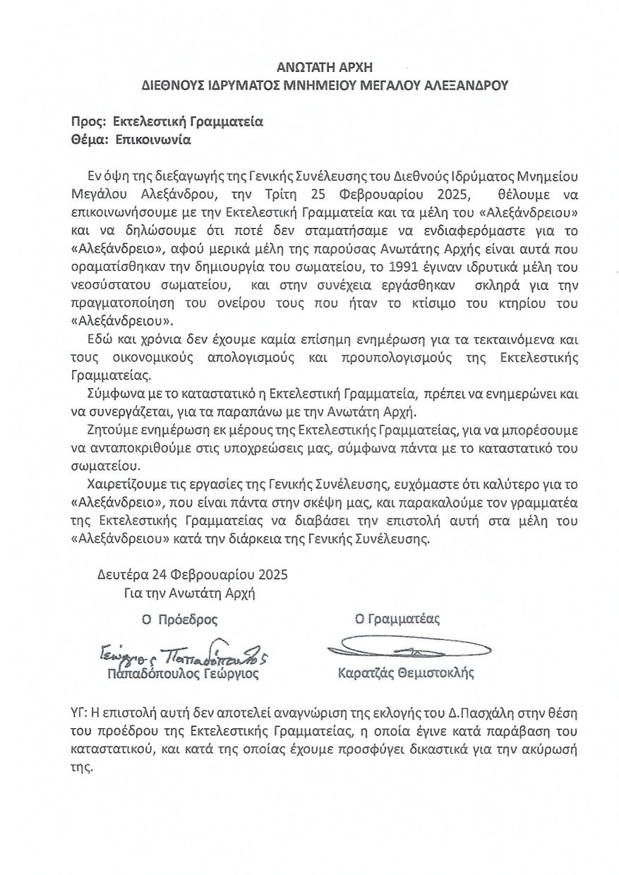 Ενδεικτικό της κατάστασης αυτής είναι ότι πριν την πρόσφατη Γενική Συνέλευση της 25ης Φεβρουαρίου 2025, ως Ανωτάτη Αρχή, στείλαμε επιστολή προς την Εκτελεστική Γραμματεία, για να διαβαστεί από τον Γραμματέα κατά την διάρκεια της Γενικής Συνέλευσης. Όχι μόνο δεν διαβάστηκε κατά την διάρκεια της Γενικής Συνέλευσης, αλλά ακούστηκαν ψεύδη και μειωτικοί χαρακτηρισμοί για τις προθέσεις μας.