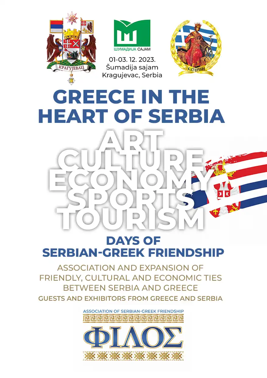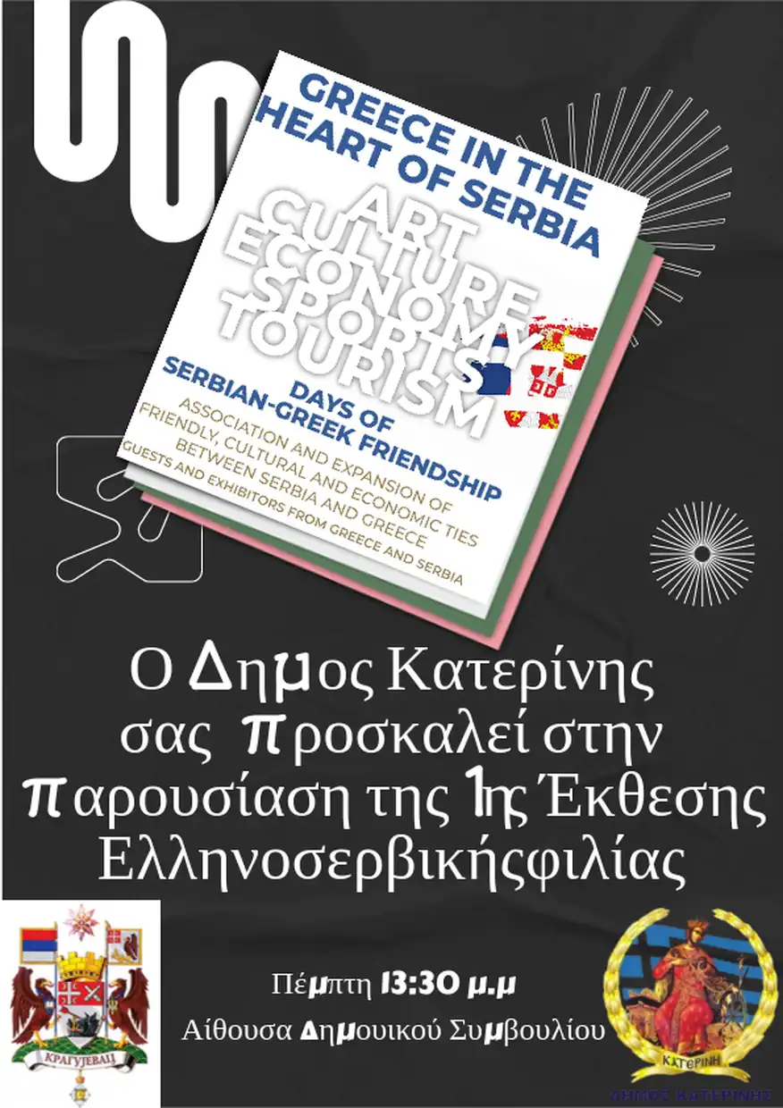 Η Αντιδημαρχία Τουρισμού του Δήμου Κατερίνης σας προσκαλεί στην παρουσίαση του 1ου Φεστιβάλ Ελληνοσερβικής Φιλίας, Greece In The Heart Of Serbia, που θα πραγματοποιηθεί στις 1-3 Δεκεμβρίου 2023 στην πόλη του Kragujevac, στη Σερβία, από τον Δήμο Kragujevac σε συνεργασία με τον οργανισμό Ελληνοσερβικής φιλίας “ΦΙΛΟΣ” και την Αντιδημαρχία Τουρισμού του Δήμου Κατερίνης.