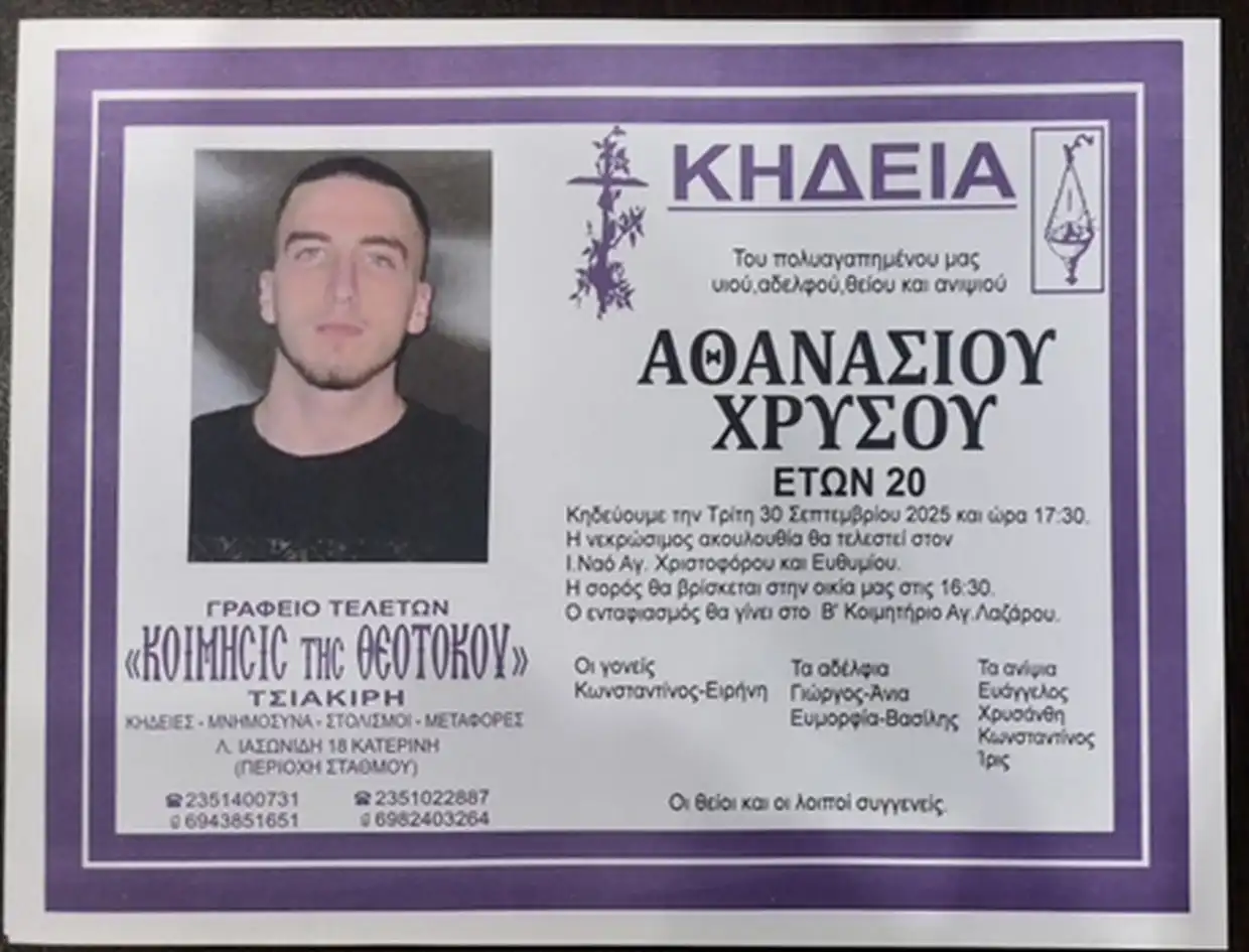 Η νεκρώσιμος ακολουθία θα τελεστεί την Τρίτη 30 Σεπτεμβρίου 2025 και ώρα 17.30 μ.μ. από τον Ιερό Ναό Αγίου Χριστοφόρου και Ευθυμίου στην Κατερίνη.