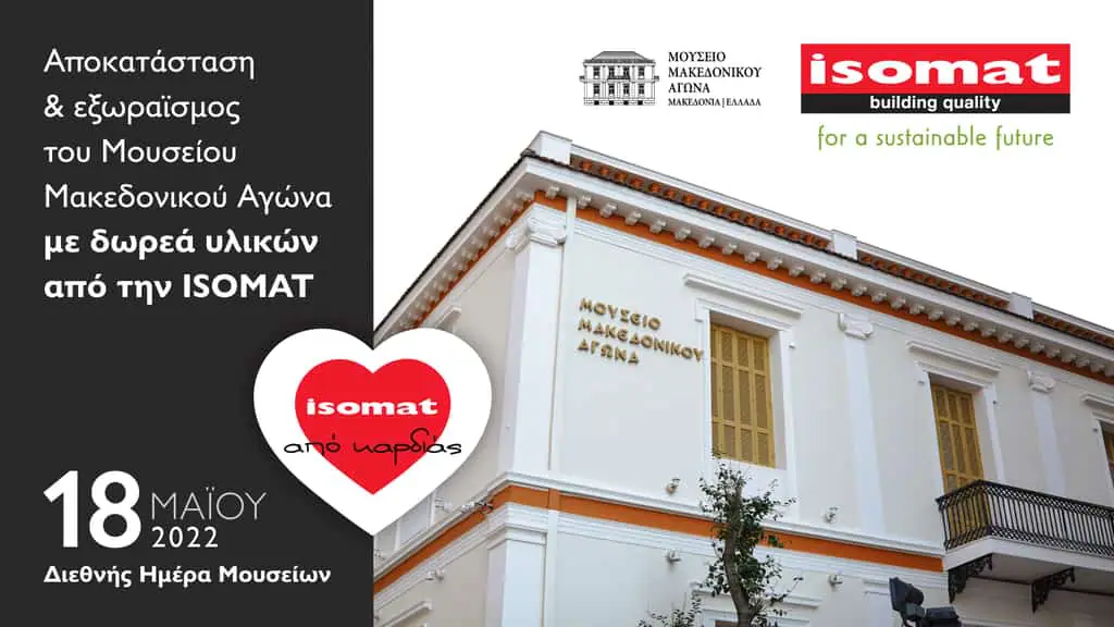 Με αφορμή την 18η Μαΐου, Διεθνή Ημέρα Μουσείων, ο Όμιλος ISOMAT με περηφάνια παρουσιάζει την ολοκλήρωση της αποκατάστασης και του συνολικού εξωραισμού των εξωτερικών όψεων και του προαύλιου χώρου του ιστορικού κτιρίου του Μουσείου Μακεδονικού Αγώνα στη Θεσσαλονίκη, εξ’ ολοκλήρου με υλικά που προσέφερε ο Όμιλος «από καρδιάς».