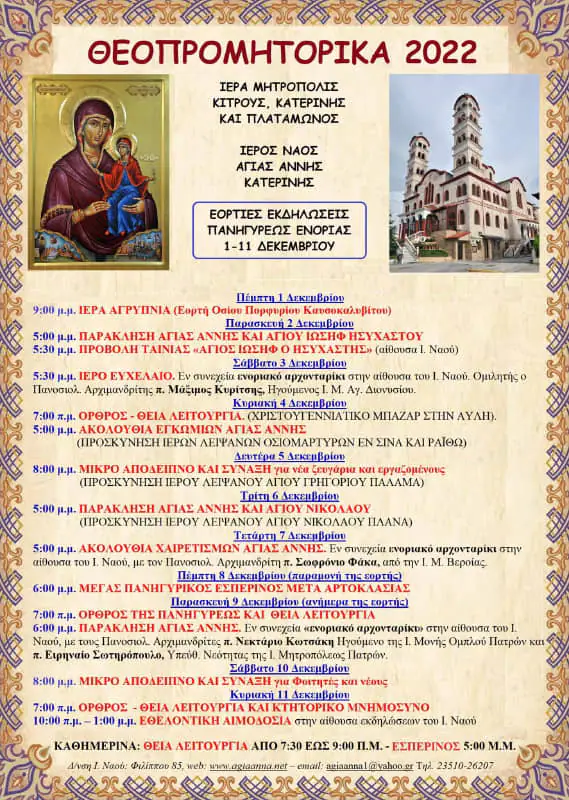 Για ακόμη μια χρονιά η Ιερά Μητρόπολη Κίτρους, Κατερίνης και Πλαταμώνος γίνεται οικοδέσποινα μια μεγάλης γιορτής της Ορθοδοξίας, μιας μεγάλης γιορτής της πνευματικότητας. Με αφορμή τον Εορτασμό της Σύλληψης της Αγίας Θεοπρομήτορος Άννης, μητέρας της Υπεραγίας Θεοτόκου, η Ιερά Μητρόπολη και ο ομώνυμος Ενοριακός Ιερός Ναός της Κατερίνης διοργανώνουν τις καθιερωμένες  λατρευτικές και πνευματικές εκδηλώσεις με την επωνυμία «ΘΕΟΠΡΟΜΗΤΟΡΙΚΑ».