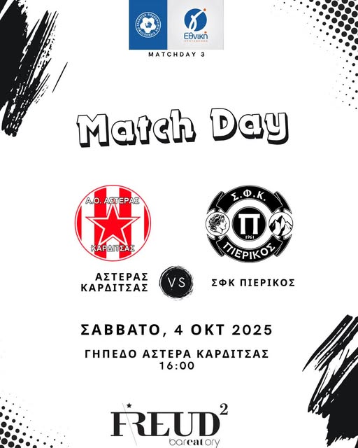 Στην Καρδίτσα εκστρατεύει ο Πιερικός όπου το Σάββατο  4 Οκτωβρίου και ώρα 16.00 θα τεθεί αντιμέτωπος με τον Αστέρα Καρδίτσας στο πλαίσιο της 3ης αγωνιστικής για τον 2ο όμιλο της Γ’ Εθνικής κατηγορίας.