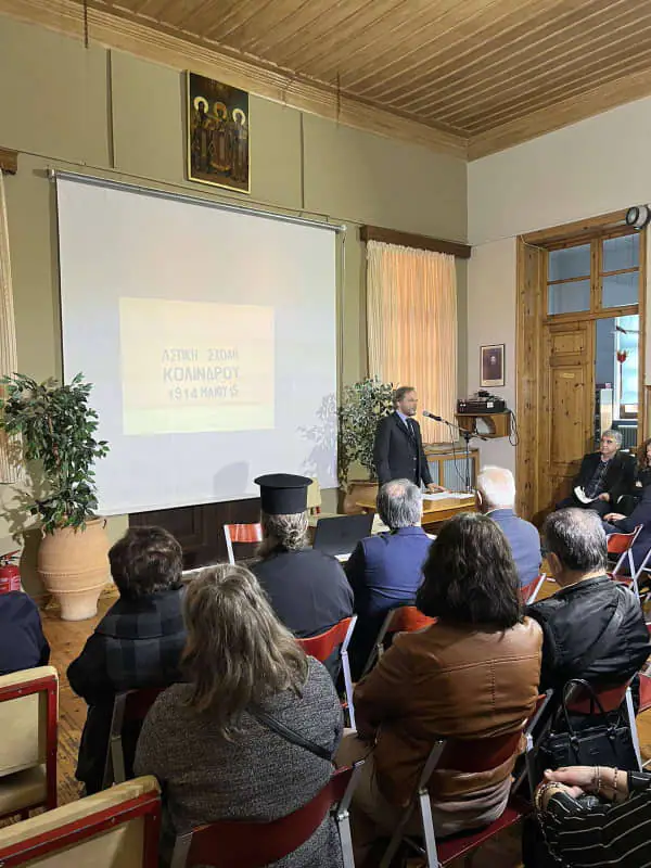 Ειδικά  για την Αστική  Σχολή Κολινδρού η οποία  στεγάστηκε στο ιστορικό κτίριο  που  έγινε και η  διάλεξη  είπε  ότι  τα υπάρχοντα αρχεία  χρονολογούνται από την  περίοδο του τέλους του 19ου αιώνα και τις αρχές του 20ου καθώς τα προηγούμενα καταστράφηκαν με την  επανάσταση του Κολινδρού το 1878.