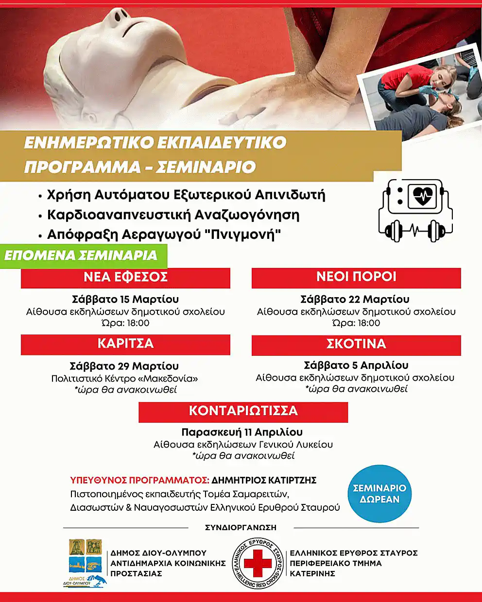 Τα ενημερωτικά σεμινάρια, που διεξάγονται δωρεάν σε κάθε δημοτική κοινότητα, είναι μία συνδιοργάνωση της Αντιδημαρχίας Κοινωνικής Προστασίας του Δήμου Δίου-Ολύμπου σε συνεργασία με το Περιφερειακό Τμήμα Κατερίνης του Ελληνικού Ερυθρού Σταυρού.