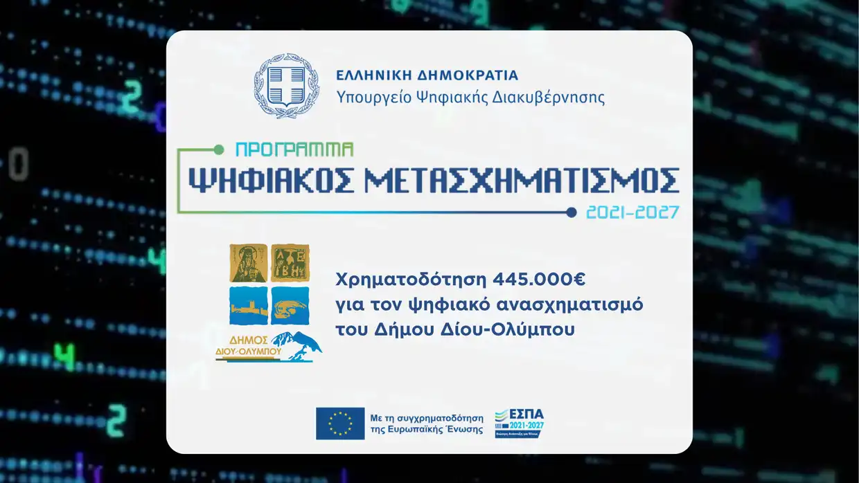 Ολύμπιο Βήμα » Πιερία » Δίον - Όλυμπος » Χρηματοδότηση 445.000€ από το υπουργείο Ψηφιακής Διακυβέρνησης για τον ψηφιακό ανασχηματισμό του Δήμου Δίου-Ολύμπου