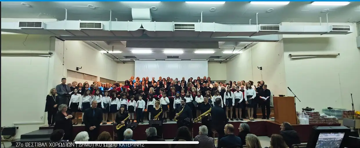Χριστουγεννιάτικες μελωδίες, χαμόγελα και παρατεταμένα χειροκροτήματα πλημμύρισαν το βράδυ του Σαββάτου 20 Δεκεμβρίου 2025 την κατάμεστη αίθουσα εκδηλώσεων του 2ου και 5ου ΓΕΛ Κατερίνης, όπου πραγματοποιήθηκε το 27ο Φεστιβάλ Χορωδιών του Δημοτικό Ωδείο Κατερίνης. Μικρές και μεγάλες φωνές, πιάνο, πνευστά και χορωδιακές ερμηνείες δημιούργησαν μια ζεστή, γιορτινή ατμόσφαιρα, βάζοντας το κοινό στο πνεύμα των Χριστουγέννων.
