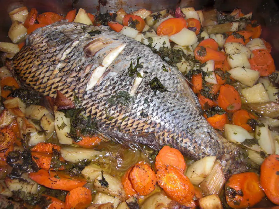 – Όταν πεινάσετε, σας έχουμε ετοιμάσει φαγητό, – φυσικά δικής μας παραγωγής, ψαρόσουπα κακαβιά με σέλινο και καρότα, και συναγρίδα στο φούρνο πλακί, με πατάτες, ντομάτες, μαϊντανό και σκόρδο.