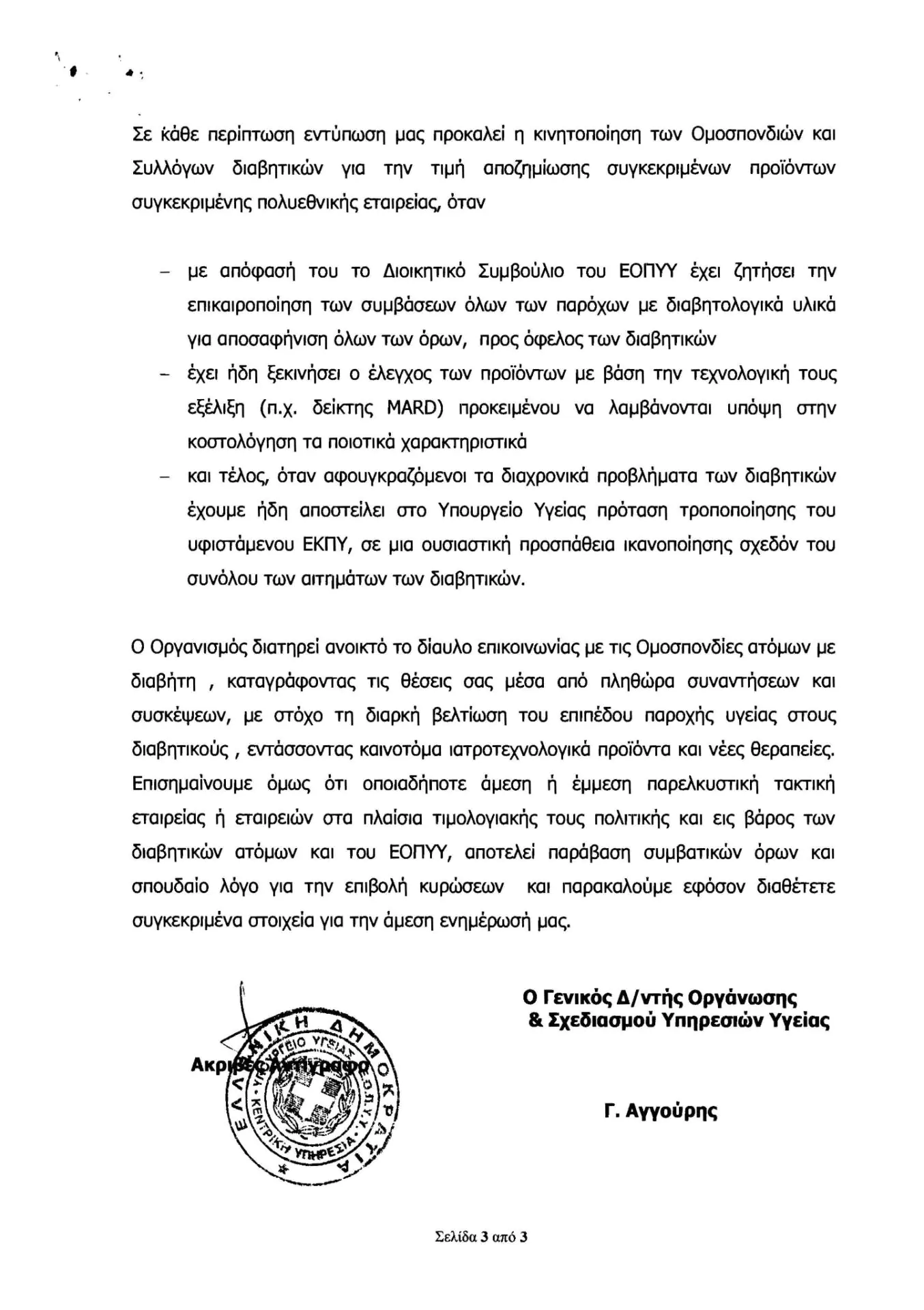 Το παραπάνω σημείο δημιούργησε ιδιαίτερη ανησυχία, η οποία όμως δεν εντάθηκε, αφού καμία άλλη φαρμακευτική εταιρία δε διαμαρτυρήθηκε. Για να μπορέσει λοιπόν η ΠΟΣΣΑΣΔΙΑ να παρέχει στους ανθρώπους με Διαβήτη αυτό που παρέχει τα 25 συναπτά έτη ύπαρξή της, δηλαδή έγκυρες και υπεύθυνες απαντήσεις, έχοντας ως μέλη της 28 πρωτοβάθμια σωματεία και εγγεγραμμένα σε αυτά περισσότερα από 100.000 άτομα, μόνο πάσχοντες από Σακχαρώδη Διαβήτη αλλά και γονείς ανήλικων παιδιών με Διαβήτη, απευθύνθηκε αποκλειστικά και μόνο στον ΕΟΠΥΥ και έθεσε ερώτημα και για το παραπάνω 2ο σημείο. Την πλήρη απάντηση μπορείτε να διαβάσετε στην επιστολή του ΕΟΠΥΥ, που επισυνάπτεται συνημμένα, αλλά εν ολίγοις ο Οργανισμός αναφέρει ότι η εταιρεία μπορεί μόνο να προσβάλει τη σύμβασή της με τον ΕΟΠΥΥ και να αποσύρει ΟΛΑ τα προϊόντα της ανεξαρτήτως κατηγορίας πάθησης και όχι μόνο συγκεκριμένα προϊόντα.