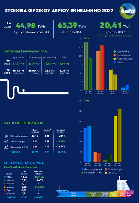 Συγκεκριμένα, σύμφωνα με τα σχετικά στοιχεία του ΔΕΣΦΑ για το διάστημα Ιανουάριος – Σεπτέμβριος 2022, η συνολική ζήτηση φυσικού αερίου (εγχώρια κατανάλωση & εξαγωγές) αυξήθηκε κατά 13,47%, φτάνοντας τις 65,39 Τεραβατώρες (TWh) από 57,63 TWh, σε σχέση με την ίδια περίοδο του περασμένου έτους. Μείωση σε ποσοστό 14,25% σημειώθηκε στην εγχώρια κατανάλωση από 52,46 TWh στις 44,98 TWh, ενώ αξιοσημείωτη ήταν αύξηση των εξαγωγών φυσικού αερίου κατά 294,73%, από 5,17 TWh σε 20,41 TWh.