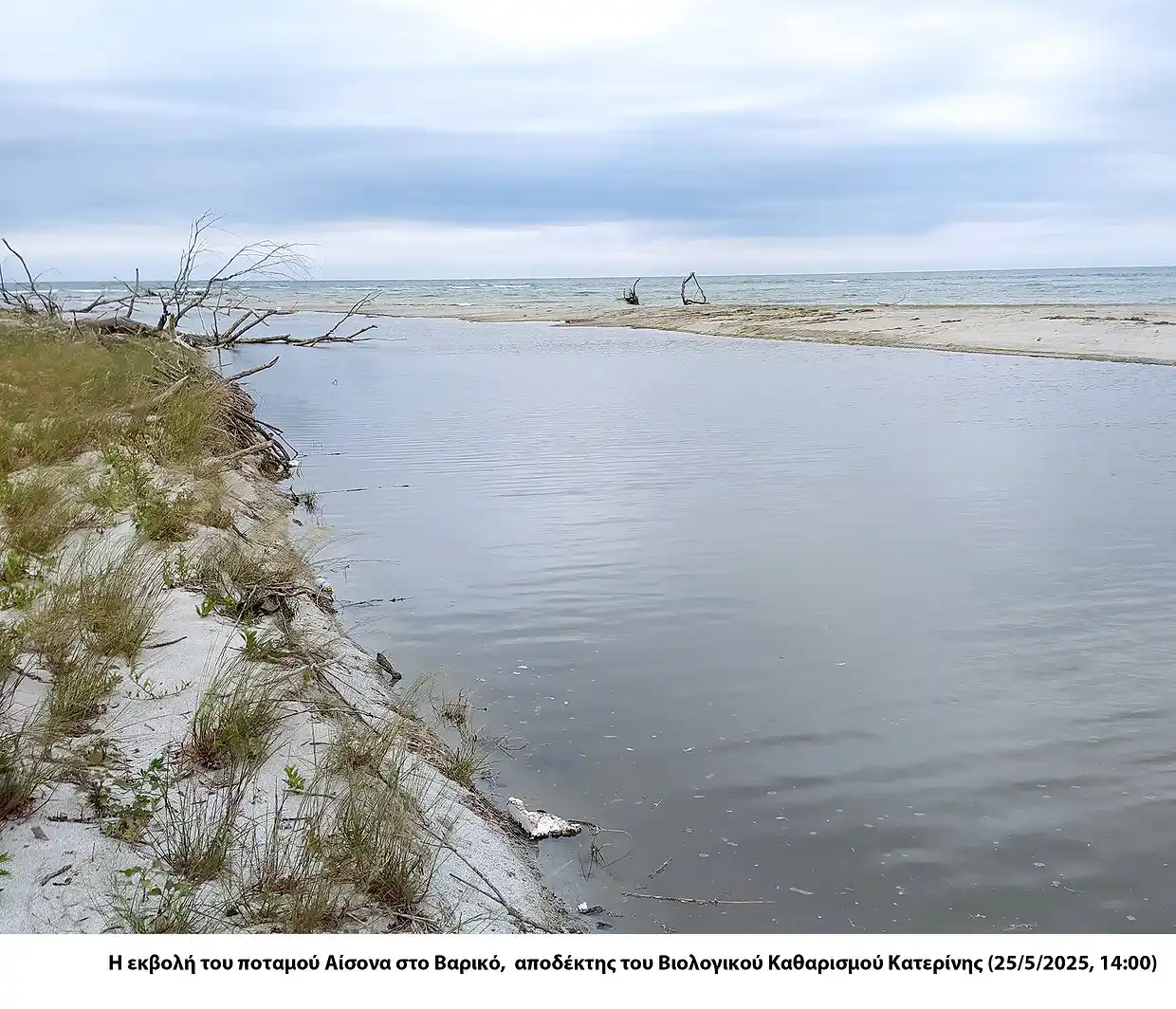 Το σημείο που εμφανίζεται σε βίντεο που αναρτήθηκε στα κοινωνικό δίκτυα και αφορά σε ρέμα που καταλήγει στη θάλασσα, δεν σχετίζεται σε καμία περίπτωση με τον αποδέκτη του Βιολογικού Καθαρισμού Κατερίνης, που είναι ο ποταμός Αίσονας, ο οποίος εκβάλλει σε άλλο σημείο της ακτογραμμής.