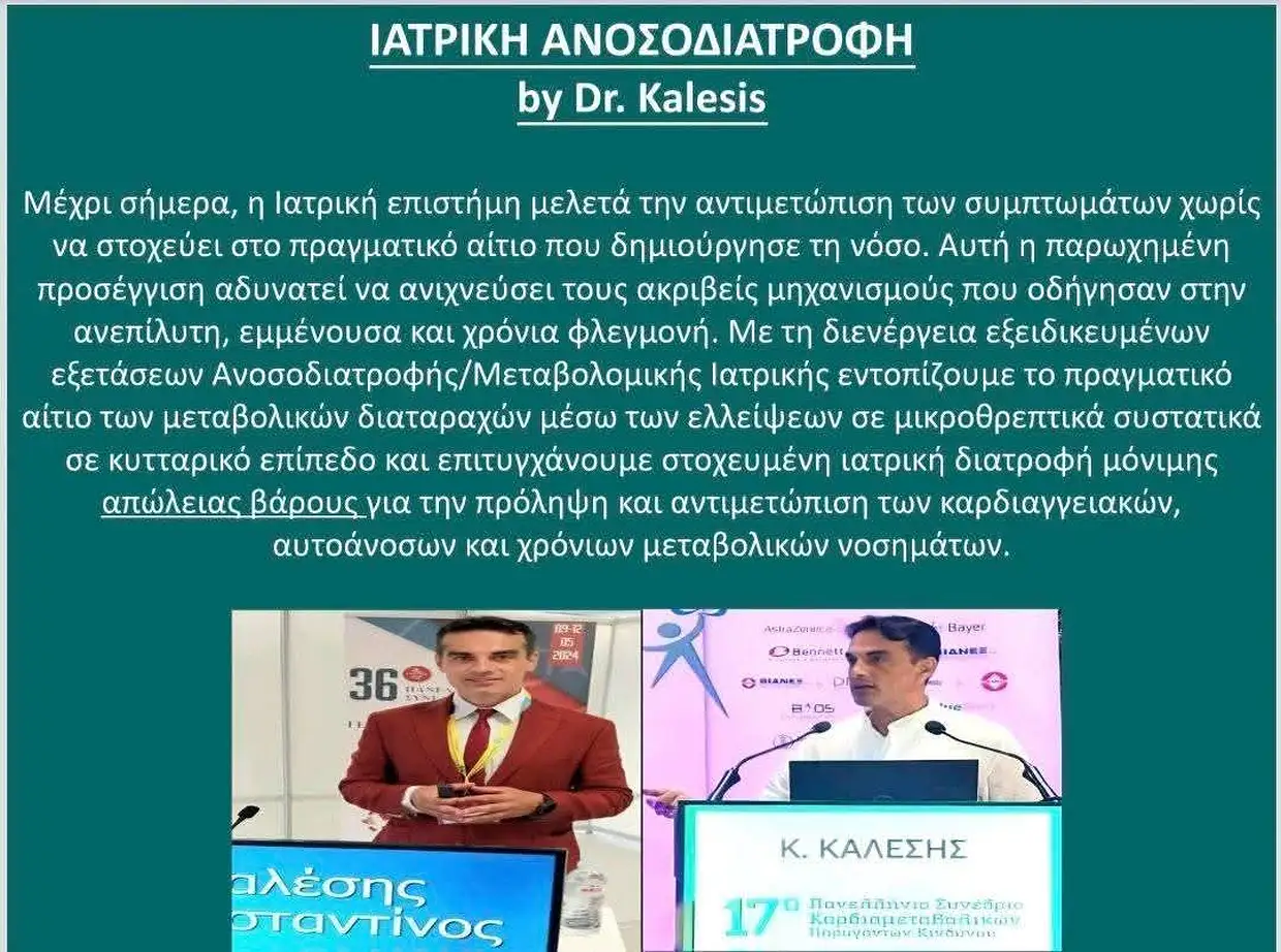 Στο συστεγασμένο ιατρείο της κυρίας Αναστασιάδου Δομνικής, Ειδικού Δερματολόγου-Αφροδισιολόγου και κ.Καλέση Κωνσταντίνου, Ειδικού Γενικού Ιατρού, Διαβητολόγου και Κλινικού Διατροφολόγου, εφαρμόζεται από τον δεύτερο, η μεταβολομική ιατρική η οποία στοχεύει: