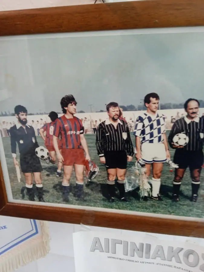 Κύπελλο Ελλάδας ΕΠΟ, Αύγουστος 1989 Αιγινιακός – ΠΑΣ Γιάννινα  (0-1), διακρίνεται ο αρχηγός του Αιγινιακού Δημήτρης Κοεμτζής (με την κυανέρυθρη στολή), με τον ομόλογό του Χαρίση.