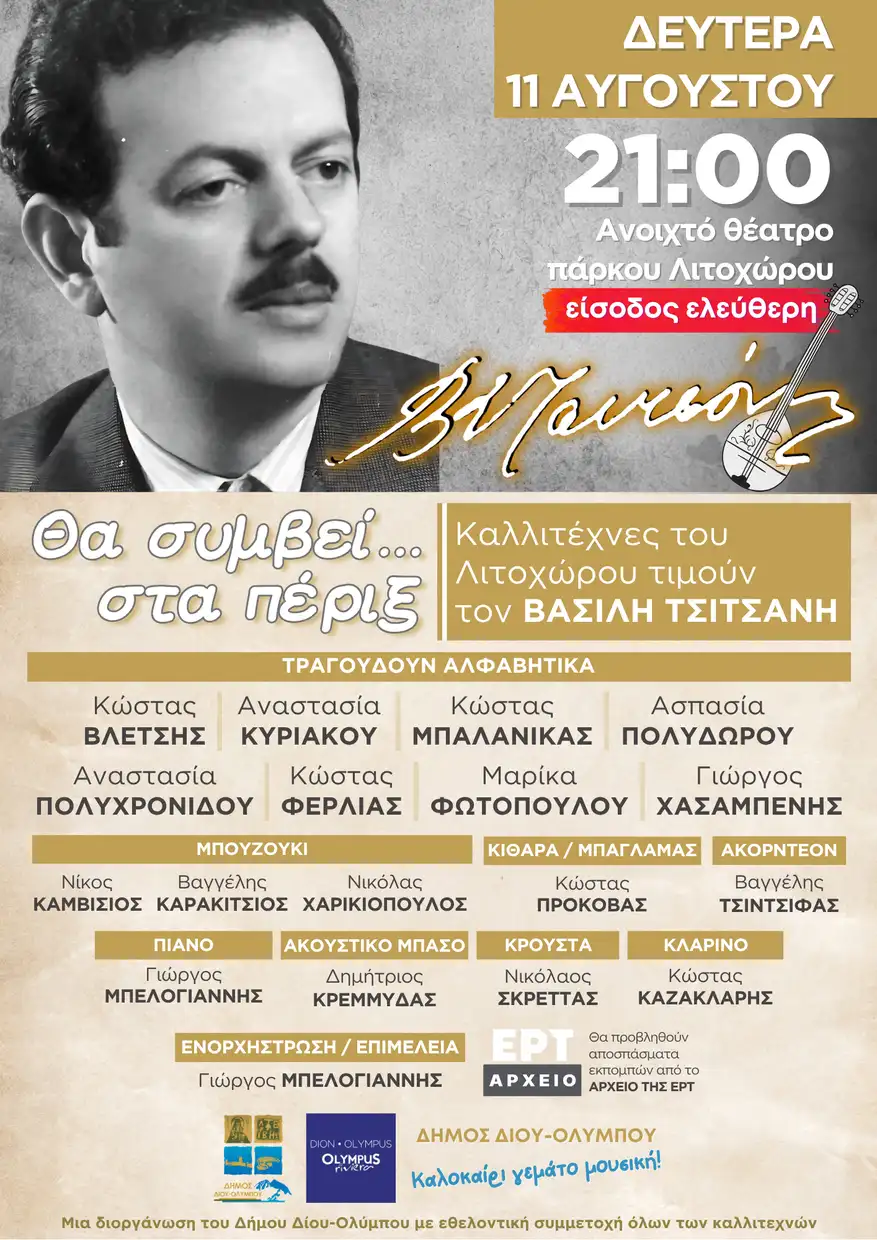 Ο Δήμος Δίου-Ολύμπου σας προσκαλεί στη συναυλία «Θα συμβεί… στα πέριξ» στο πλαίσιο του εορτασμού της επετείου των 110 χρόνων από τη γέννηση του σπουδαίου Έλληνα λαϊκού τραγουδιστή, συνθέτη και στιχουργού, Βασίλη Τσιτσάνη, απόψε στις 9 το βράδυ στο ανοιχτό θέατρο του δημοτικού πάρκου Λιτοχώρου με δωρεάν είσοδο.