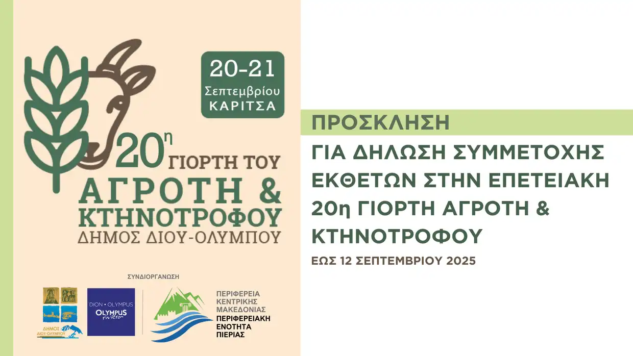 Δήμος Δίου-Ολύμπου: Έως 12 Σεπτεμβρίου οι συμμετοχές εκθετών στην 20η Γιορτή Αγρότη & Κτηνοτρόφου στην Καρίτσα