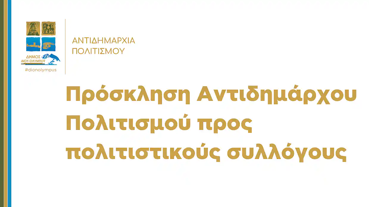Στο πλαίσιο των συναντήσεων συνεργασίας του Αντιδημάρχου Πολιτισμού Δίου-Ολύμπου, Αστέριου Τζήμα, με πολιτιστικούς συλλόγους που έχουν έδρα εντός του Δήμου, καλούνται οι πολιτιστικοί σύλλογοι να συμπληρώσουν το έντυπο επικαιροποίησης – καταχώρησης των στοιχείων τους και να ακολουθήσουν τις οδηγίες που θα βρουν στην ιστοσελίδα του Δήμου στη διεύθυνση www.dion-olympos.gr/entypo-politistikoi-syllogoi