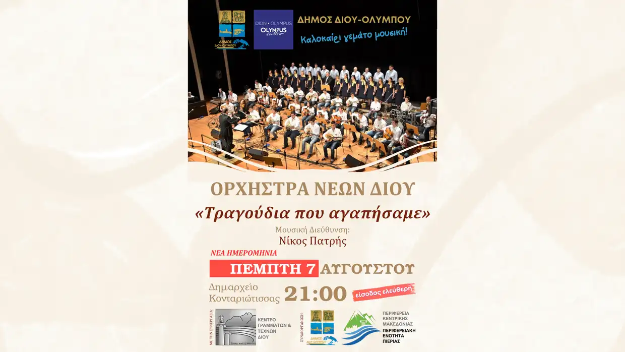 Την Πέμπτη 7 Αυγούστου 2025 στις 9 το βράδυ στο προαύλιο του Δημαρχείου Κονταριώτισσας θα πραγματοποιηθεί η συναυλία της Ορχήστρας Νέων Δίου «Τραγούδια που αγαπήσαμε», σε μουσική διεύθυνση Νίκου Πατρή, λόγω των άστατων καιρικών συνθηκών που επικρατούν απόψε, Τρίτη 5 Αυγούστου 2025 (αρχική ημερομηνία).