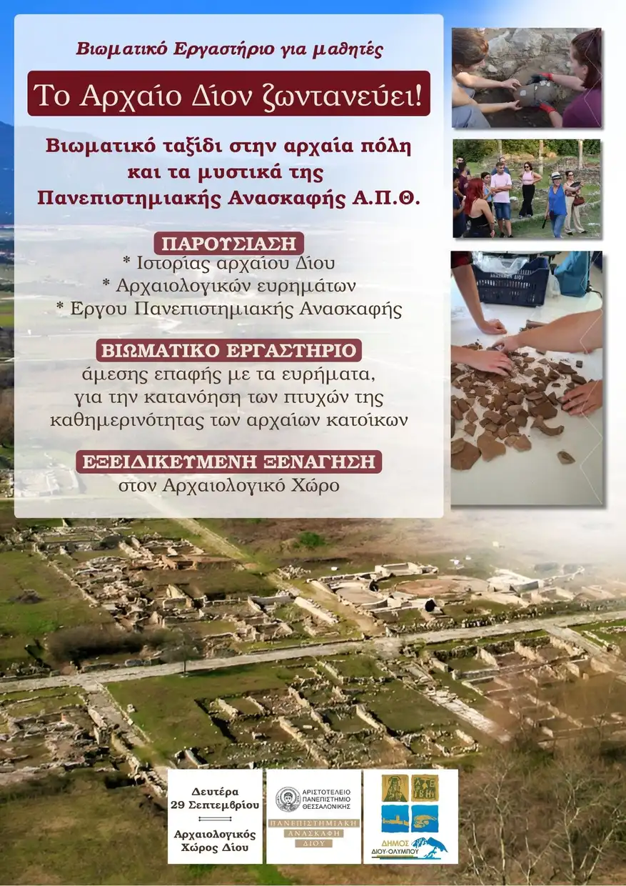 Σε ένα βιωματικό ταξίδι στην αρχαία πόλη του Δίου και τα μυστικά της Πανεπιστημιακής Ανασκαφής του Αριστοτελείου Πανεπιστημίου Θεσσαλονίκης θα έχουν την ευκαιρία να συμμετέχουν μαθητές του Γυμνασίου Κονταριώτισσας, τη Δευτέρα 29 Σεπτεμβρίου 2025.