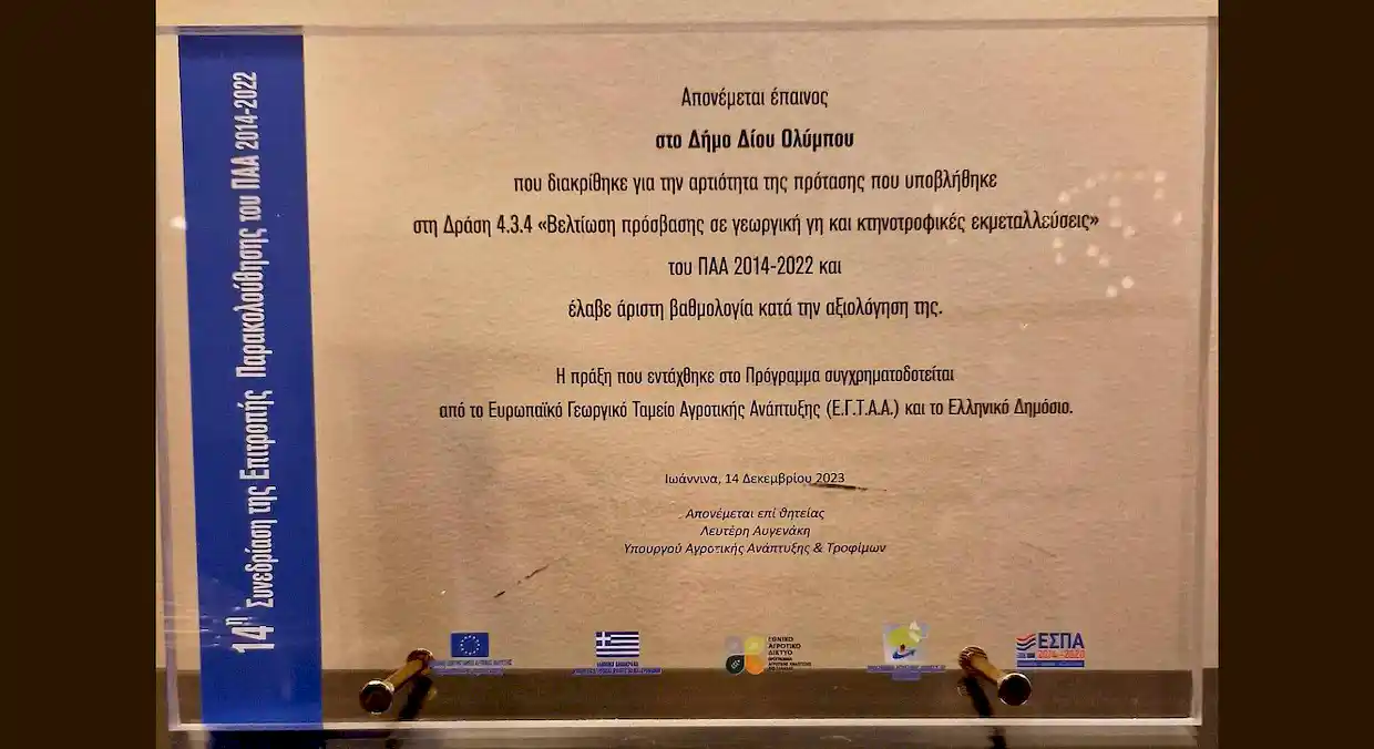 Πρόκειται για τη βράβευση που αφορά στην πρόταση που κατέθεσε ο Δήμος Δίου-Ολύμπου στη Δράση 4.3.4. για τη βελτίωση πρόσβασης σε γεωργική γη και κτηνοτροφικές εκμεταλλεύσεις του Προγράμματος Αγροτικής Ανάπτυξης 2014-2022, για ασφαλτοστρώσεις αγροτικών δρόμων στις Δημοτικές Κοινότητες Λεπτοκαρυάς, Παντελεήμονα και Σκοτίνας, ύψους 1.000.000 ευρώ, που υλοποιούνται την τρέχουσα περίοδο.