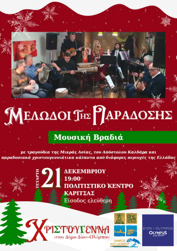 Απολαύστε ένα μουσικό ταξίδι με τραγούδια της Μικράς Ασίας, του Απόστολου Καλδάρα και παραδοσιακά χριστουγεννιάτικα κάλαντα από διάφορες περιοχές της Ελλάδας, με τους Μελωδούς της Παράδοσης απόψε στις 7 μμ στο Πολιτιστικό Κέντρο της Περιφερειακής Ενότητας Πιερίας στην Καρίτσα.