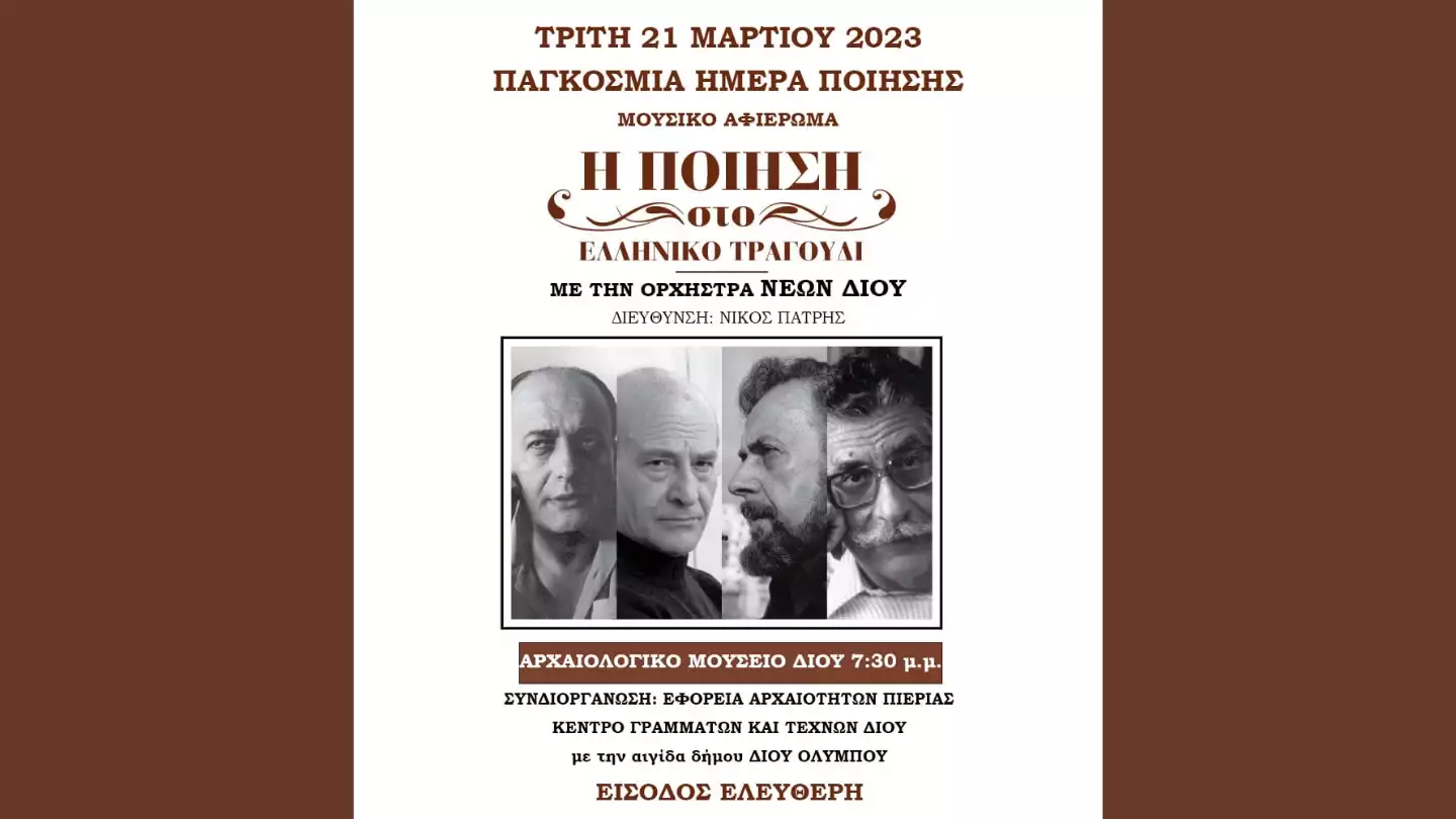Το Κέντρο Γραμμάτων και Τεχνών Δίου και η Εφορεία Αρχαιοτήτων Πιερίας, στο πλαίσιο της Παγκόσμιας Ημέρας Ποίησης, παρουσιάζουν το μουσικό αφιέρωμα “Η Ποίηση στο Ελληνικό Τραγούδι” με την Ορχήστρα Νέων Δίου, σε μουσική διεύθυνση Νίκου Πατρή την Τρίτη 21 Μαρτίου 2023 στις 19:30 στο Αρχαιολογικό Μουσείο Δίου.