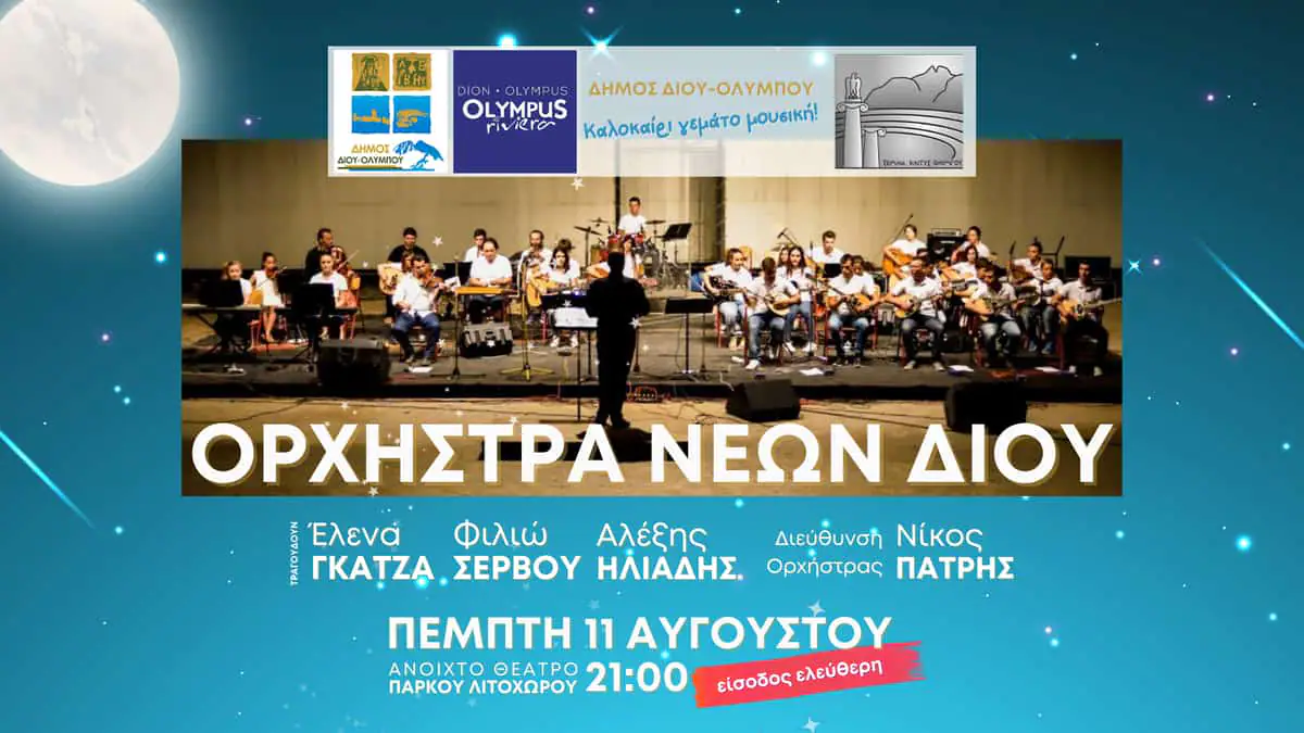 Ο Δήμος Δίου-Ολύμπου σας προσκαλεί την Πέμπτη 11 Αυγούστου 2022, στις 9 το βράδυ, στη συναυλία της Ορχήστρας Νέων Δίου στο ανοιχτό θέατρο πάρκου Λιτοχώρου, με ελεύθερη είσοδο.