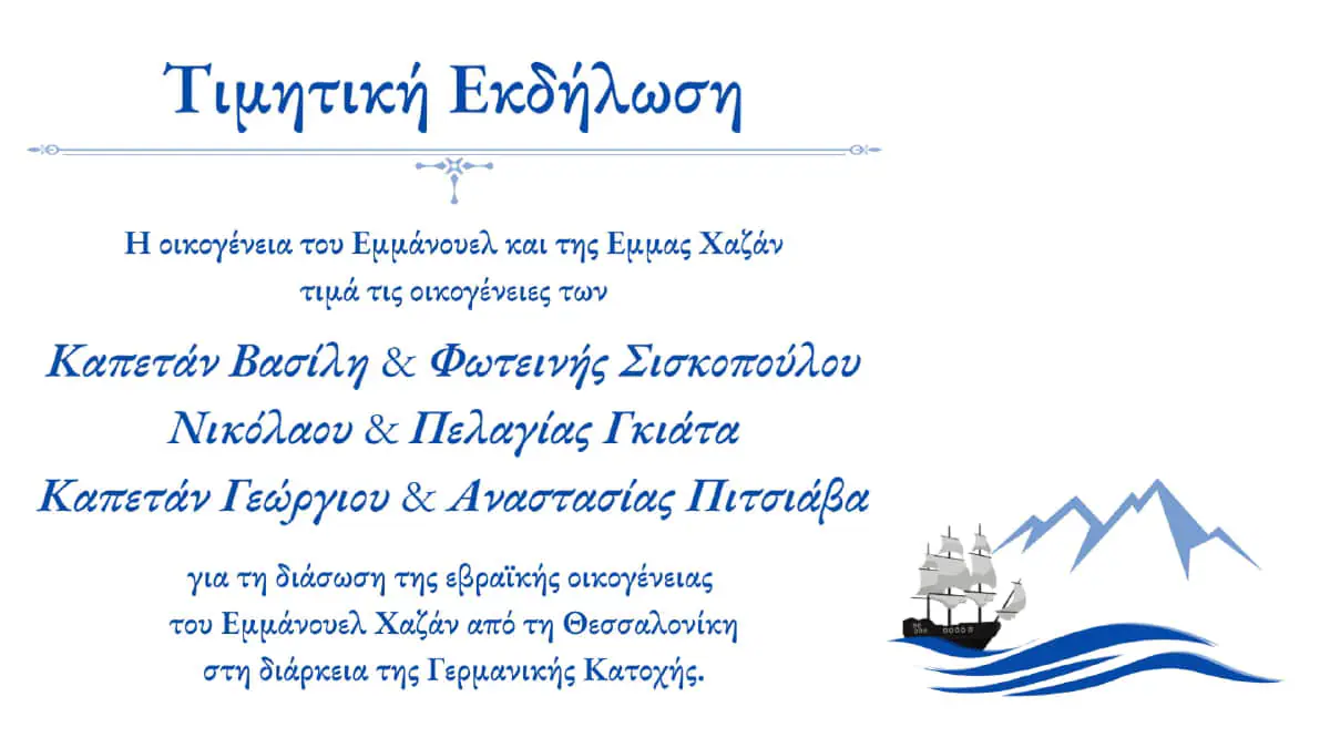 Τις οικογένειες των Καπετάν Βασίλη και Φωτεινής Σισκοπούλου, Νικολάου και Πελαγίας Γκιάτα και Καπετάν Γεωργίου και Αναστασίας Πιτσιάβα από το Λιτόχωρο, τίμησαν τα εγγόνια των Εμμάνουελ και Έμμας Χαζάν, κα Αλίκη Κοέν-Μωϋσή, κ. Φίκος Σαλτιέλ και κ. Νταβίντ Χαζάν, για τη διάσωση των παππούδων και των γονέων τους, Έττης, Ρασέλ και Μόσε κατά τη διάρκεια της Γερμανικής Κατοχής.