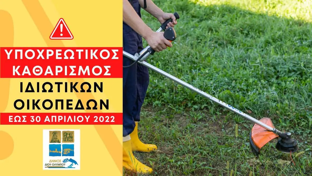 Ενόψει της αντιπυρικής περιόδου 2022, που διαρκεί από 1η Μαΐου έως και την 31η Οκτωβρίου, καλούνται όλοι οι ιδιοκτήτες, νομείς, επικαρπωτές και μισθωτές οικοπέδων ή λοιπών ακάλυπτων χώρων, που βρίσκονται εντός σχεδίου, να προβούν στον υποχρεωτικό καθαρισμό των οικοπέδων αυτών έως την 30η Απριλίου 2022, για την αποτροπή του κινδύνου πρόκλησης πυρκαγιάς ή ταχείας επέκτασής της.